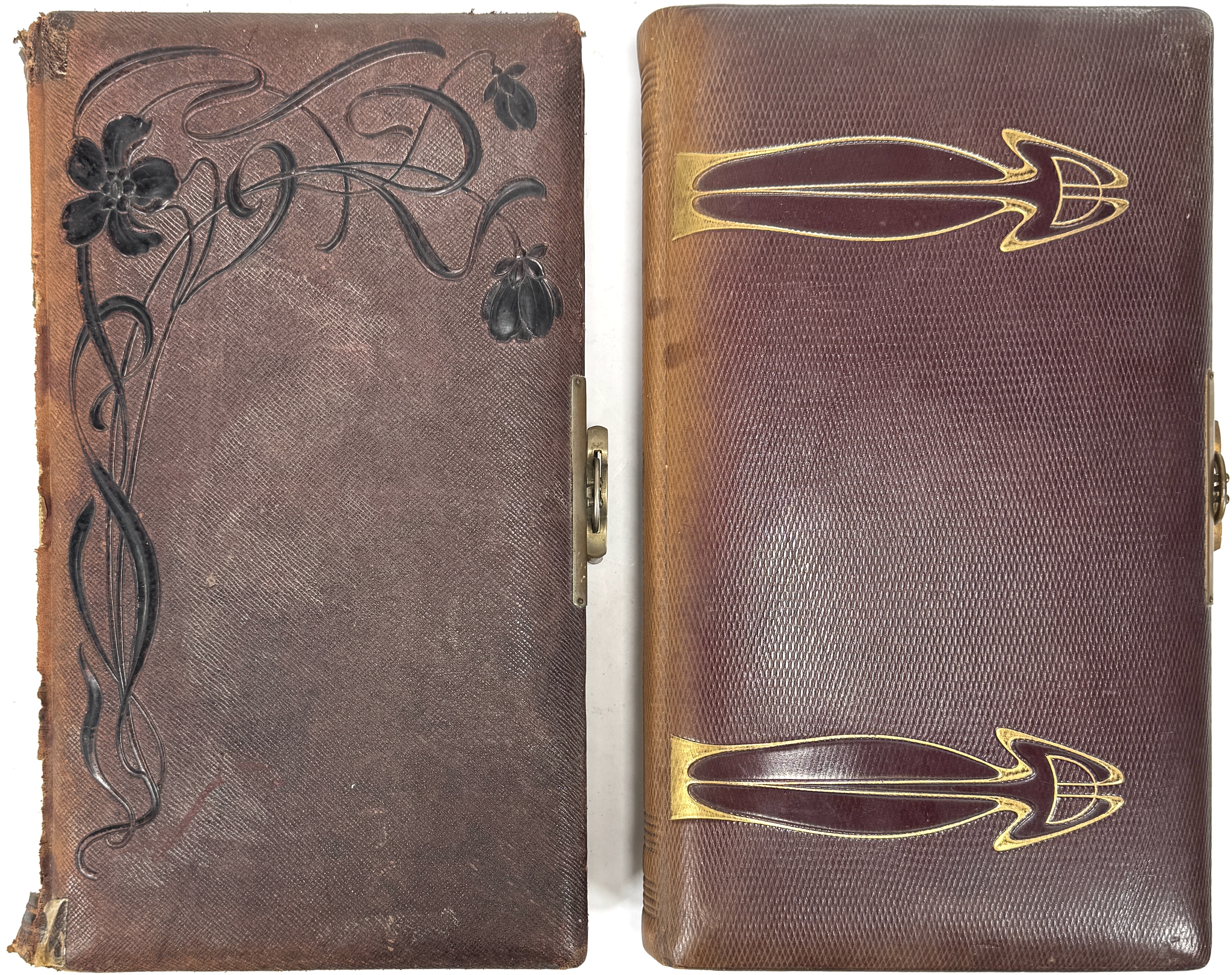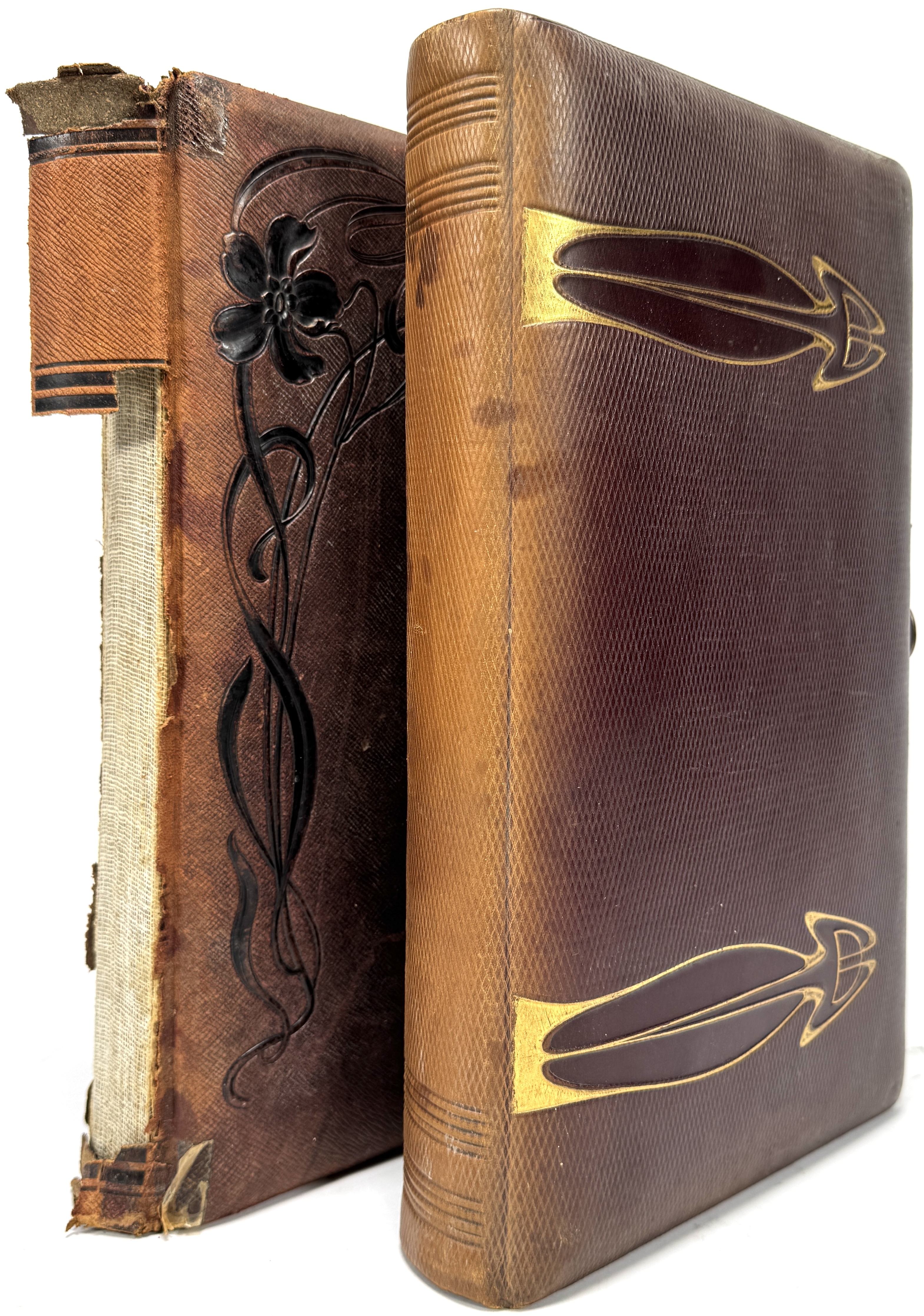 Twee fotoalbums vervaardigd in de periode 1880-1920, met reliëfversieringen en messing sluitingen. De albums bevatten zwart-witfoto’s van diverse mensen, waaronder studioportretten. Op een album is een florale versiering aangebracht en op het andere album is een ruitpatroon zichtbaar. Eerst deze oude fotoalbums zien voordat je biedt? Bezoek onze kijkdagen op 29, 30 en 31 augustus van 11:00 tot 17:00 uur! |
