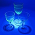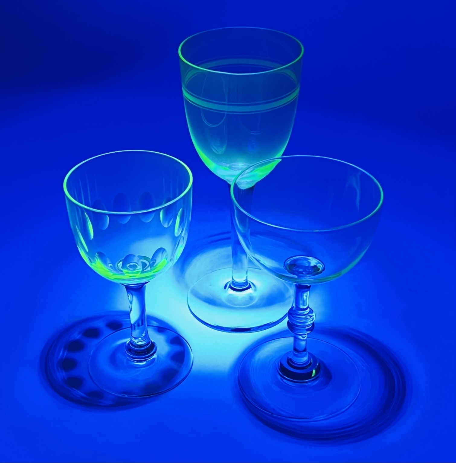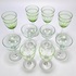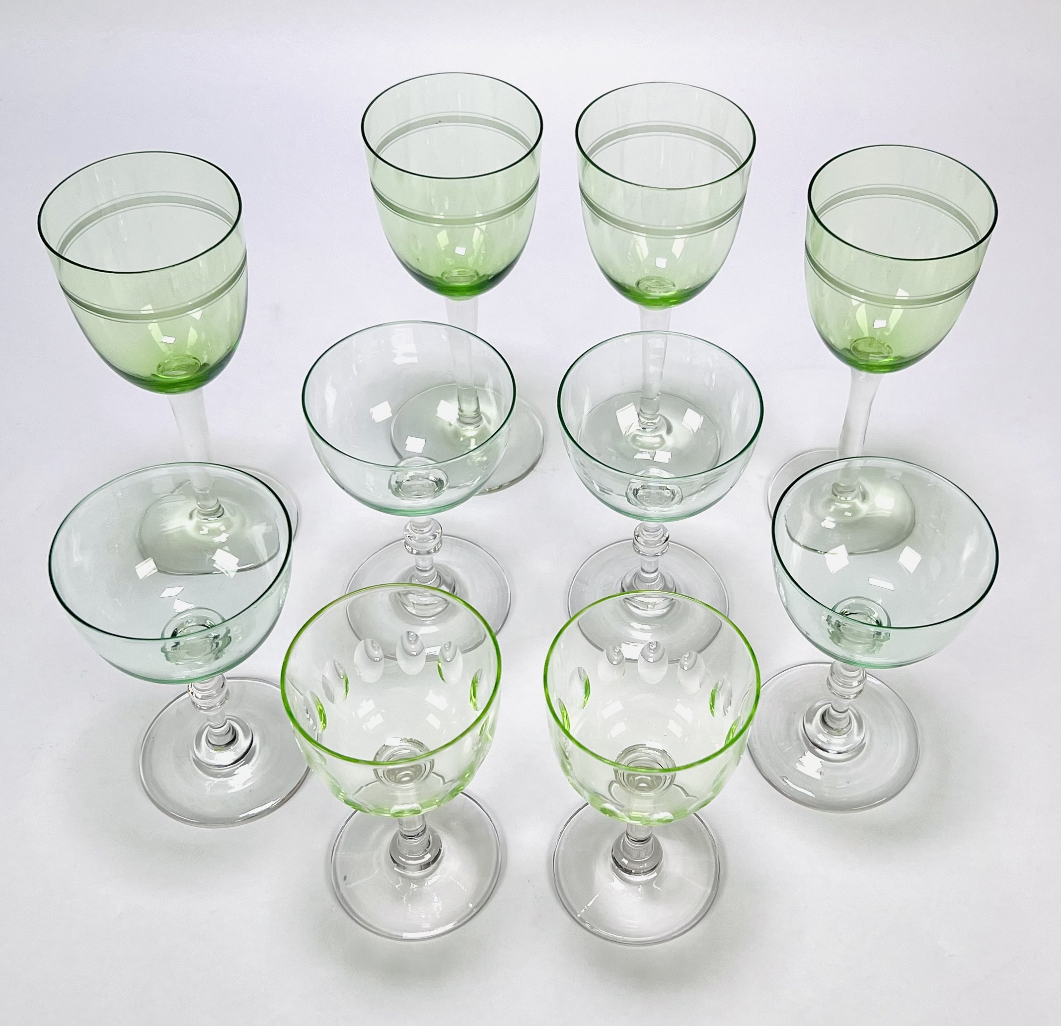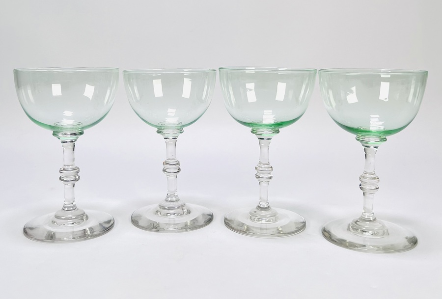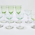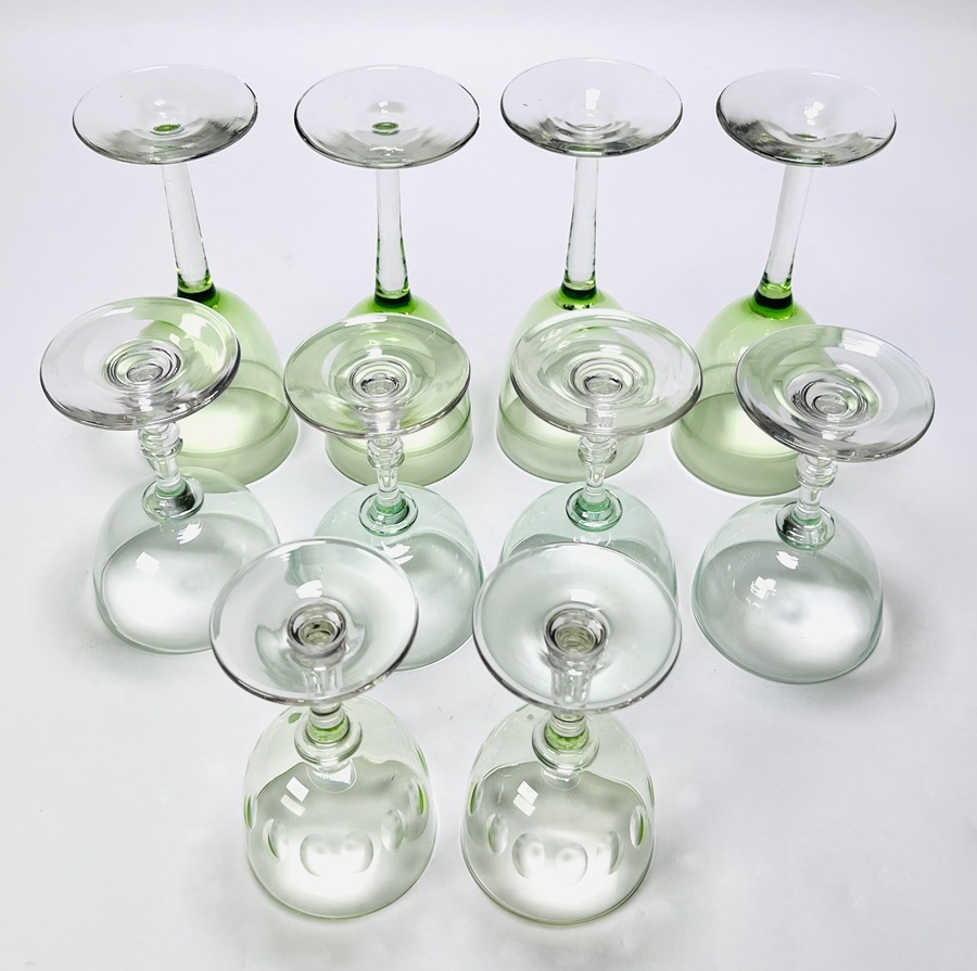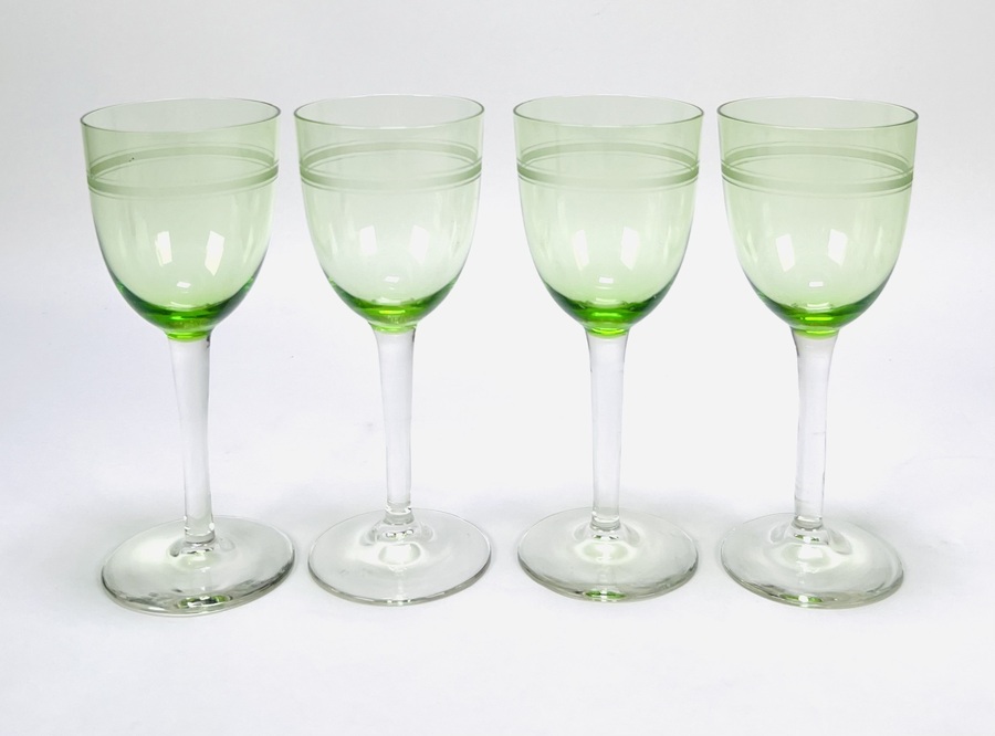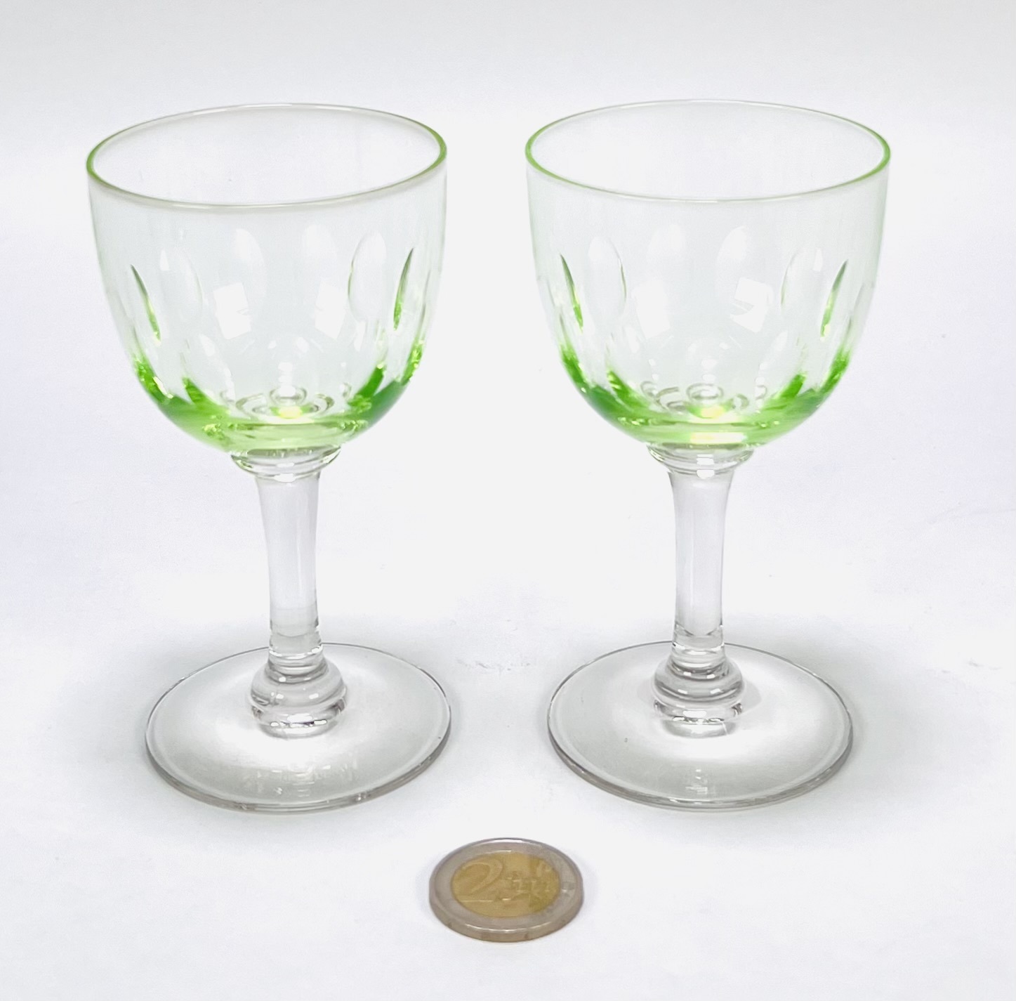 Art Deco uraniumglas glazen, eerste helft 20e eeuw (omstreeks 1920–1940). Mondgeblazen glas met uraniumoxide, gemengde techniek met optisch geblazen decor en plaatselijk geslepen en gepolijste randen. Bestaat uit wijnglazen met lichtgroene kelk en heldere stelen; bij enkele glazen dubbele bies aan de rand, knopstelen en optische ovalen. Deze glazen zelf beoordelen? Je bent welkom op onze kijkdagen op 29, 30 en 31 augustus! |