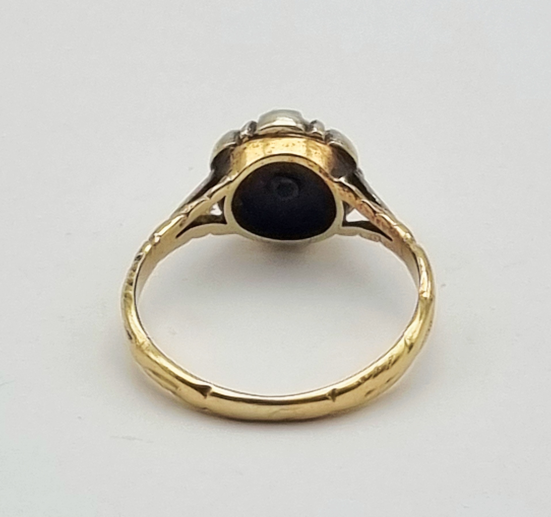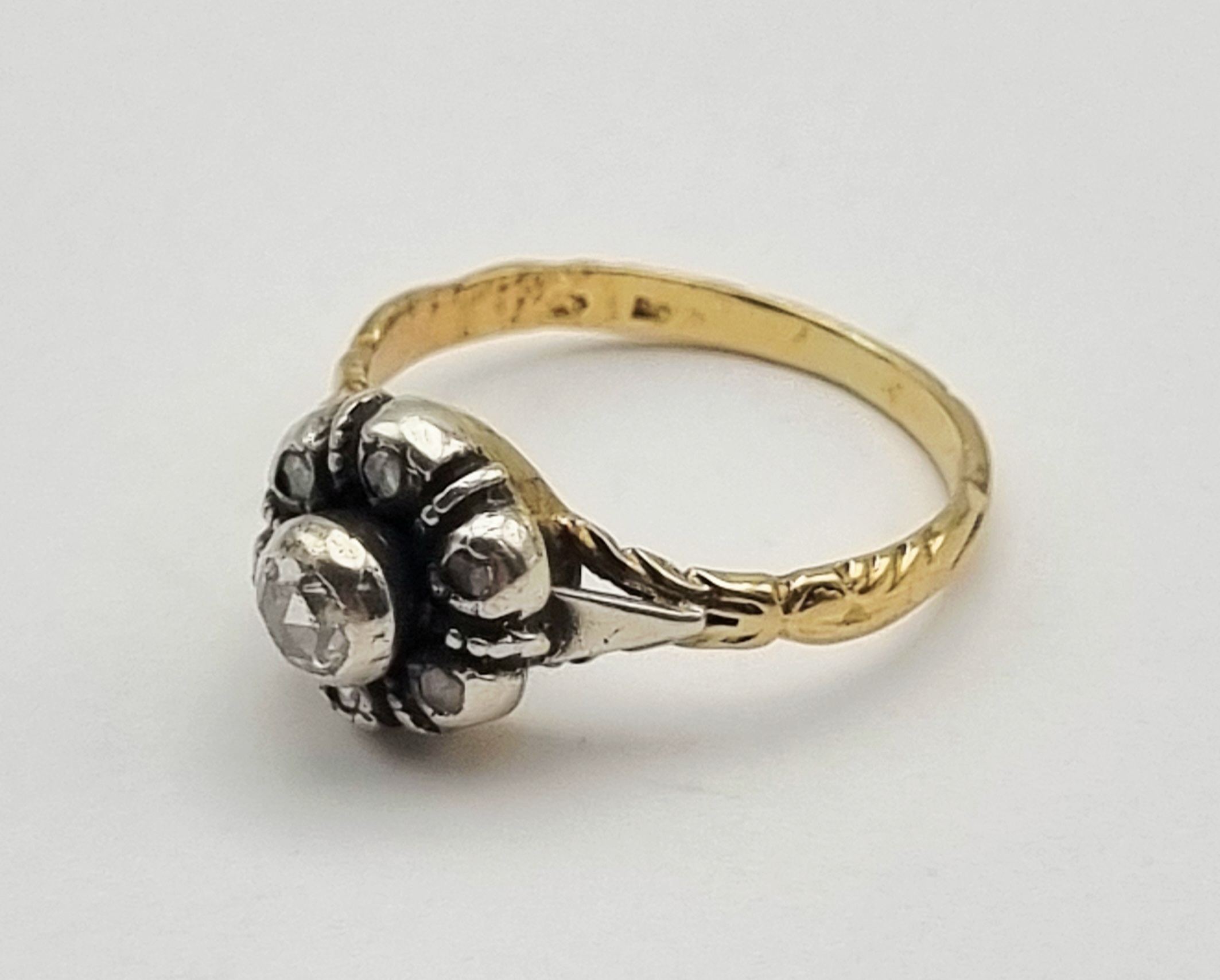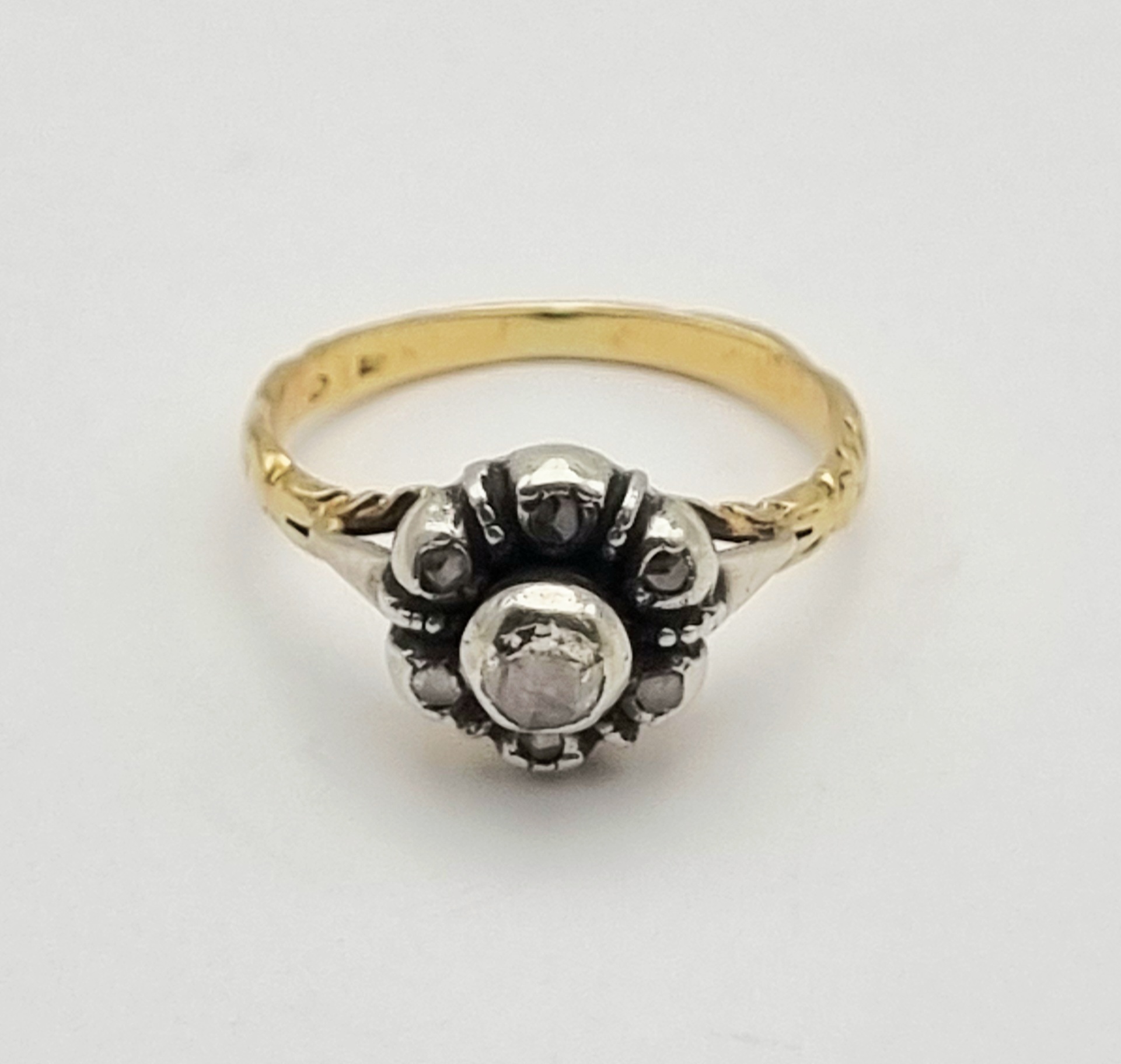 Een gouden ring in Victoriaanse stijl, daterend circa 1880-1900. De ring is gezet met een centrale roosgeslepen diamant en zes kleinere diamanten, ca. 0,14 ct. De zetting is van zilver, terwijl de ringband van 14 karaat goud is, gemerkt met het eikenblad en 585. De ring is aan de zijkanten gedecoreerd met een gravure. Wil je de ring in het echt bekijken? Kom naar de kijkdagen op 29, 30 en 31 augustus! |