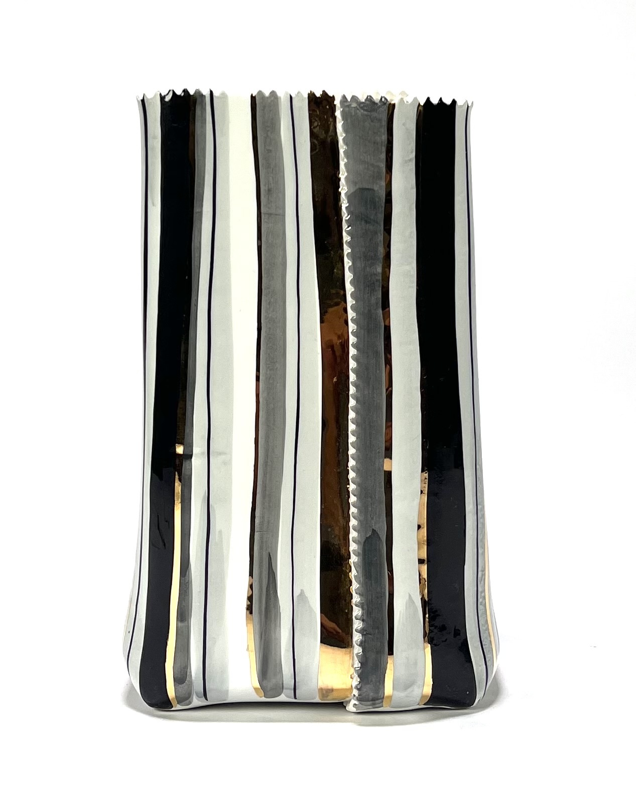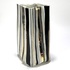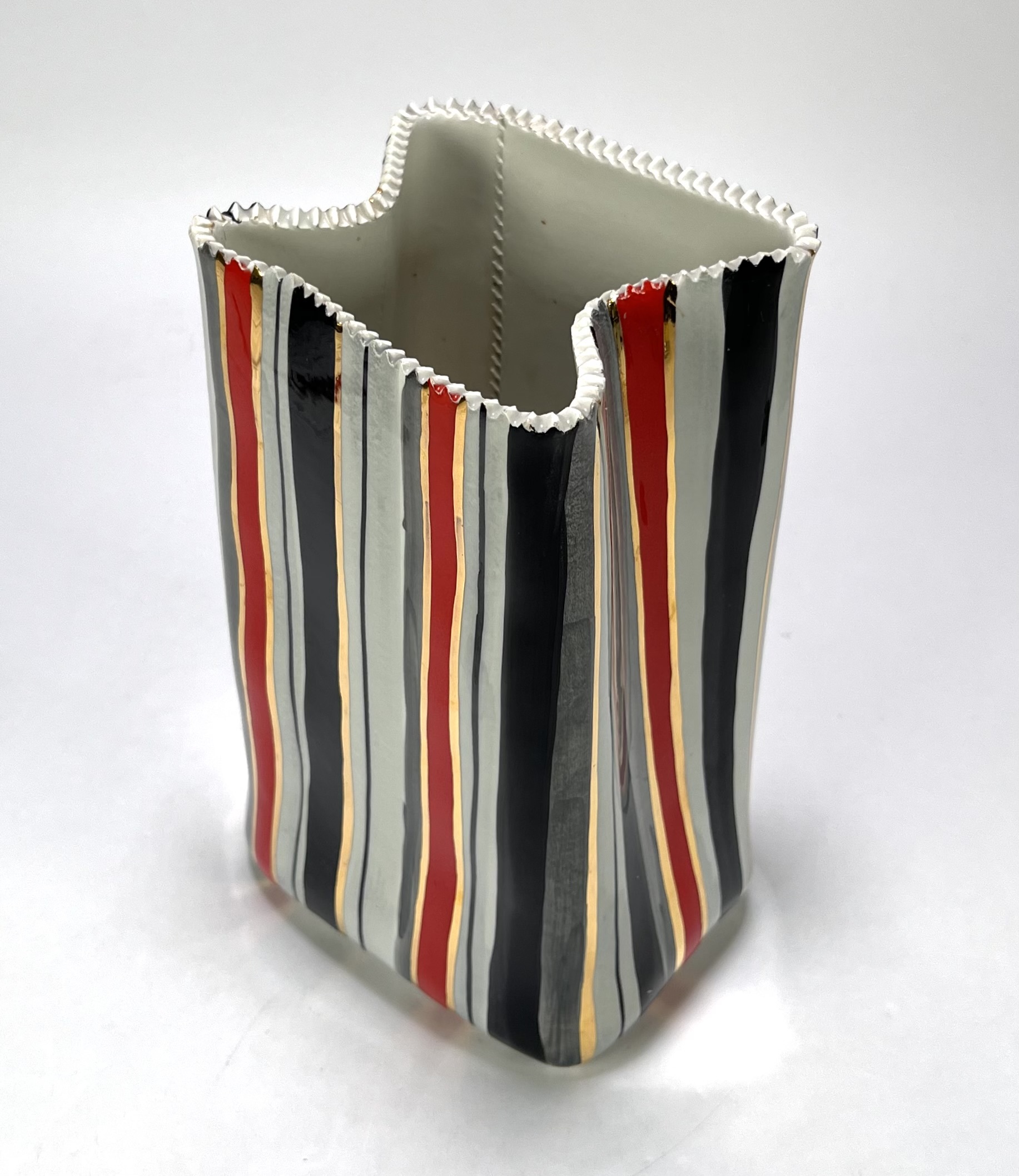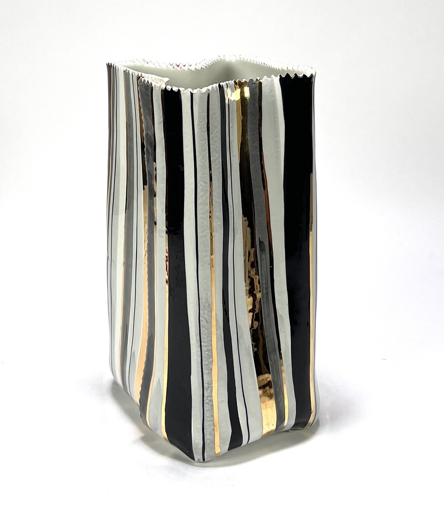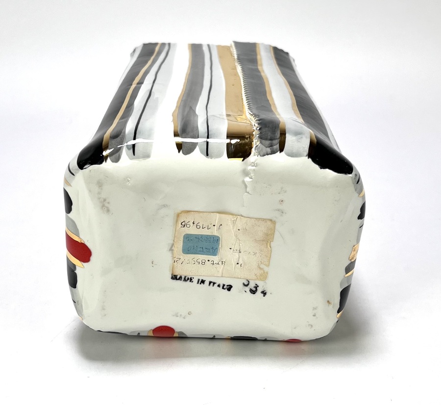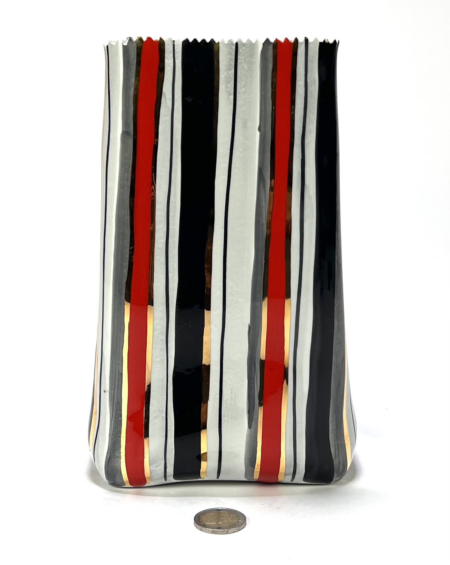 Porseleinen vaas, circa 1970-1990, uitgevoerd in een moderne abstracte stijl. De vaas heeft een vierkante, licht golvende vorm met een gekartelde bovenrand. Handbeschilderd met verticale banen in rood, zwart, grijs, goud en zilver. Onderaan gemerkt met “MADE IN ITALY” en genummerd. Kom langs tijdens de kijkdagen (29 t/m 31 augustus) en ontdek deze vaas zelf! |