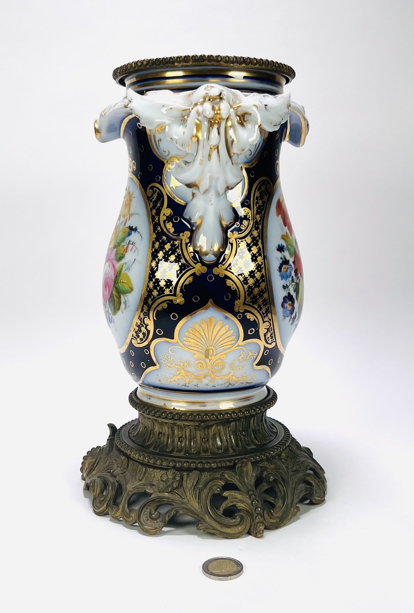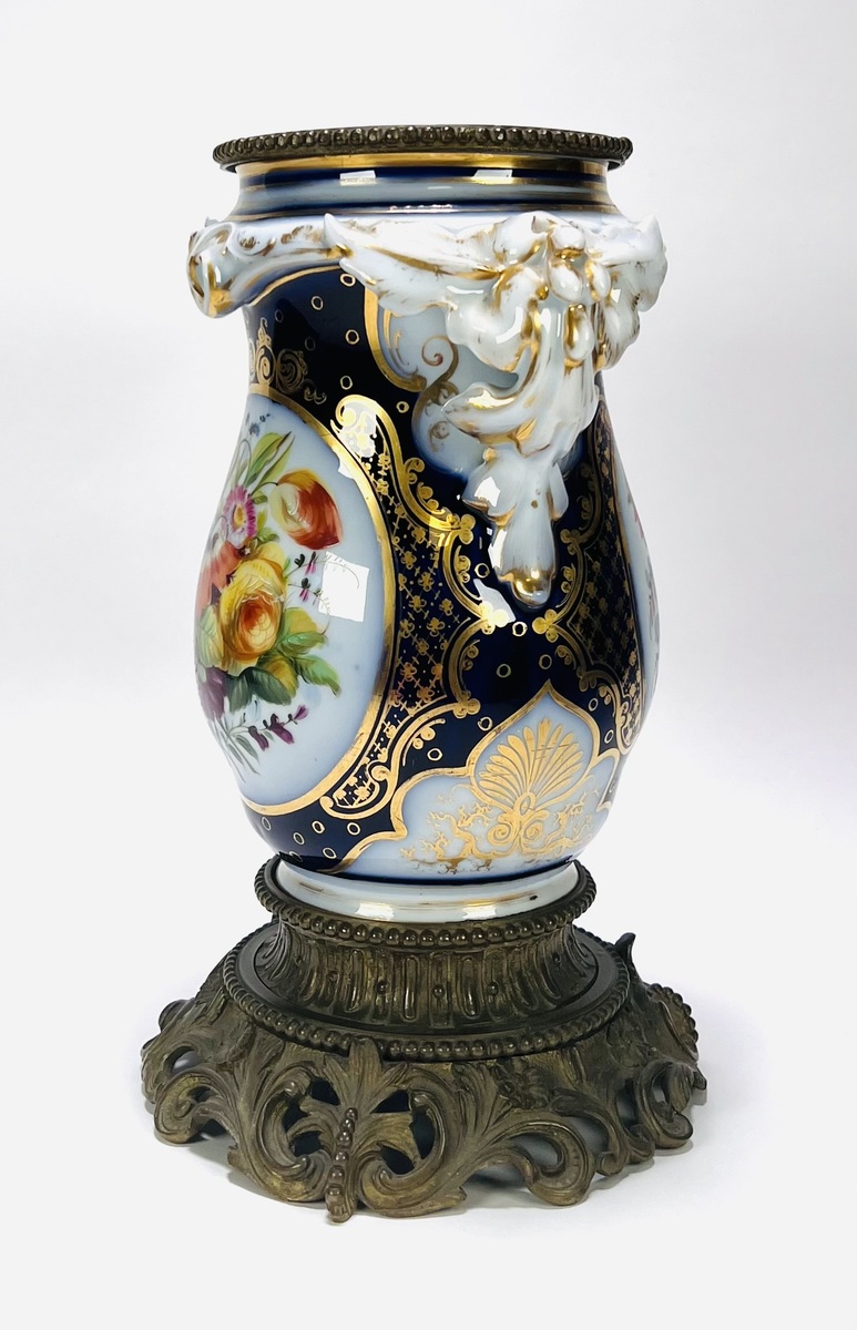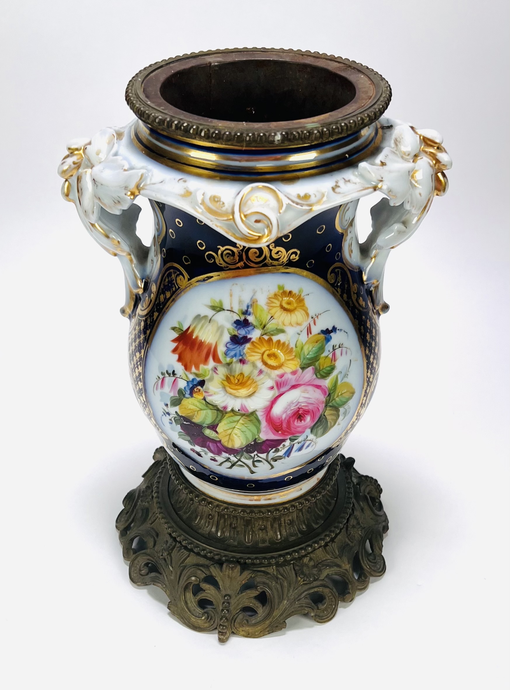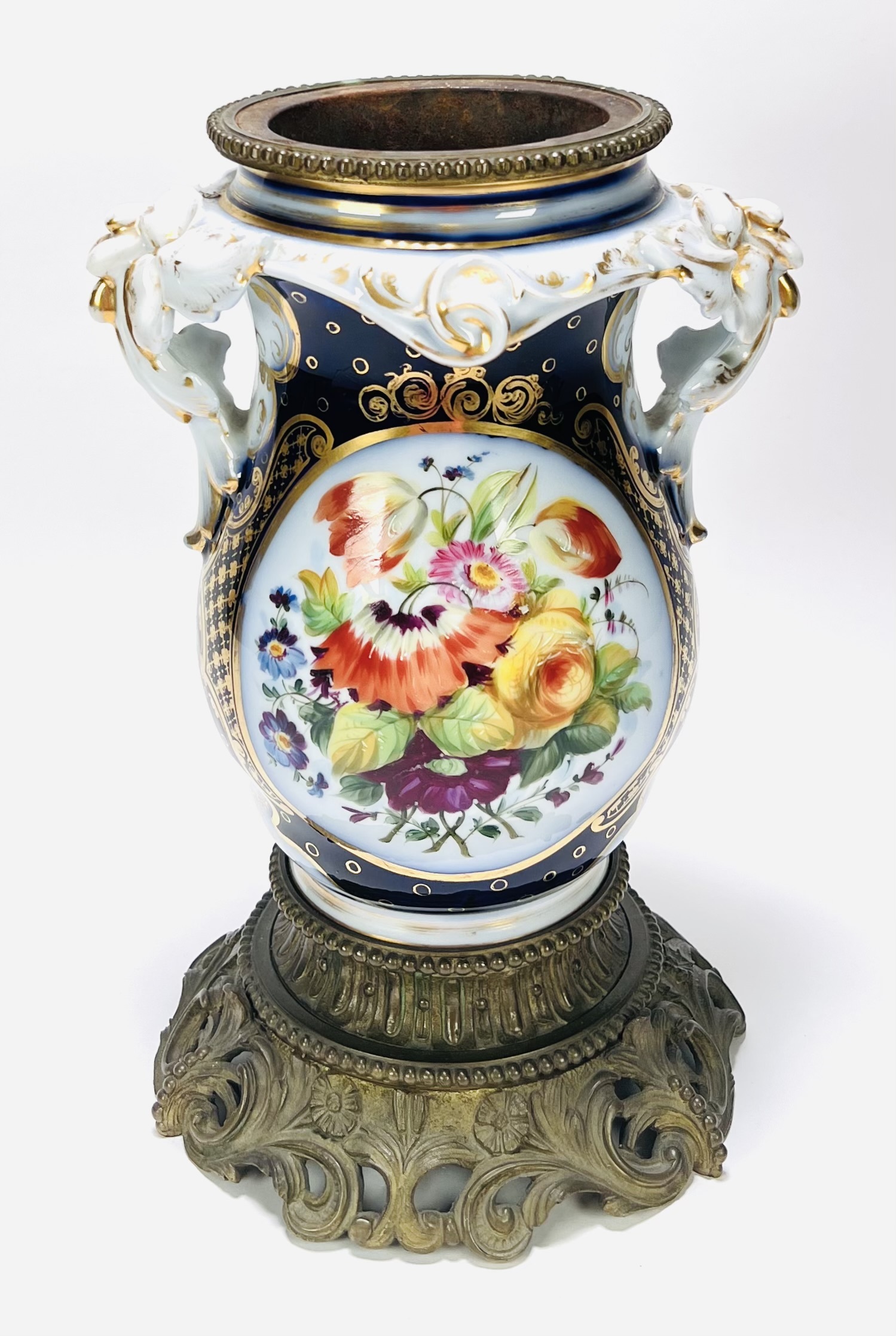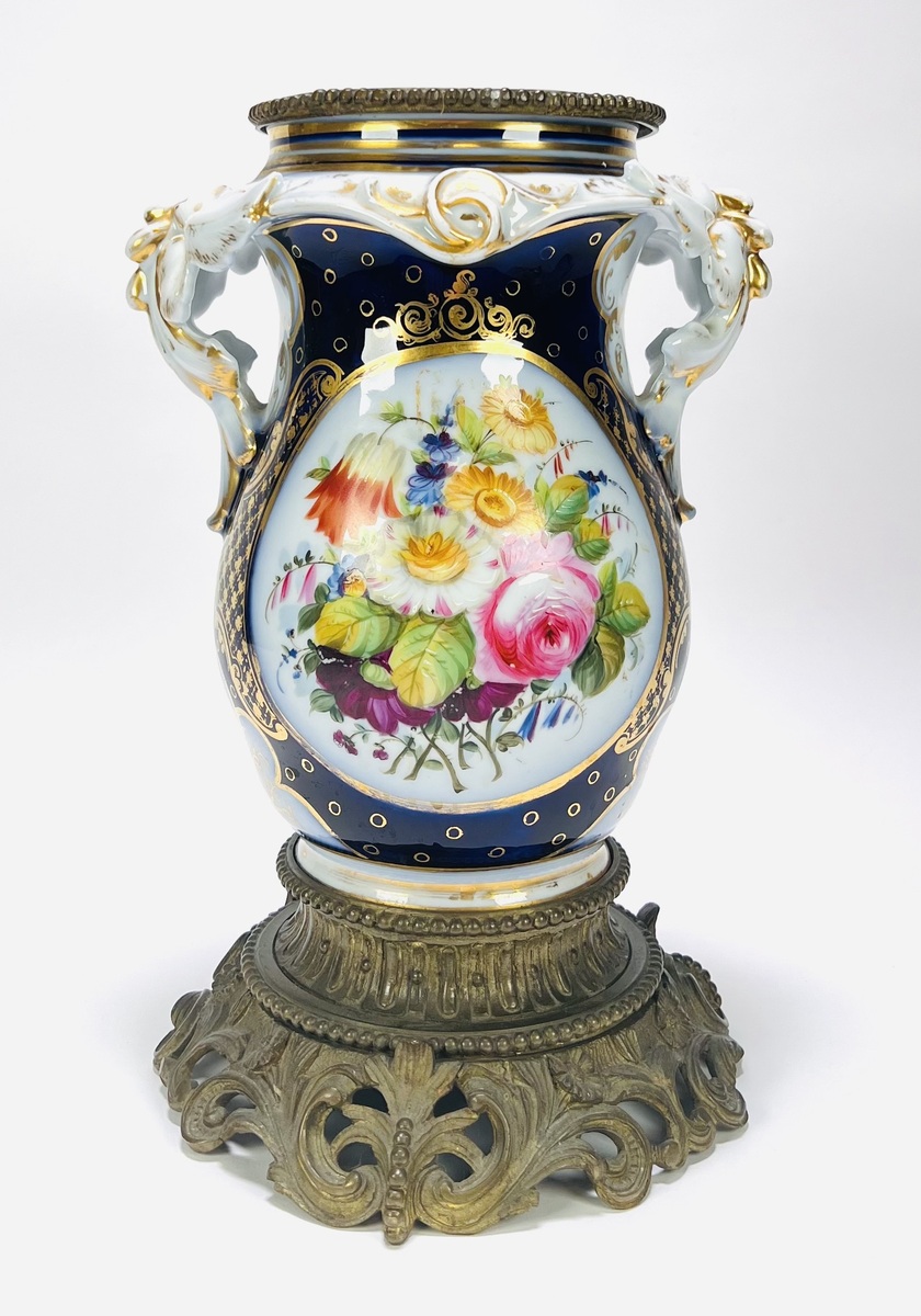 Porseleinen vaas met messing voet in neoclassicistische stijl, vervaardigd in de 19e eeuw. De vaas toont handbeschilderde bloemboeketten in polychroom binnen cartouches, omlijst door een kobaltblauwe fond met goudkleurige ornamentiek. De vaas is voorzien van rijk gemodelleerde handvatten met goudaccenten. Registreer nu en bied eenvoudig online mee op deze vaas! |
