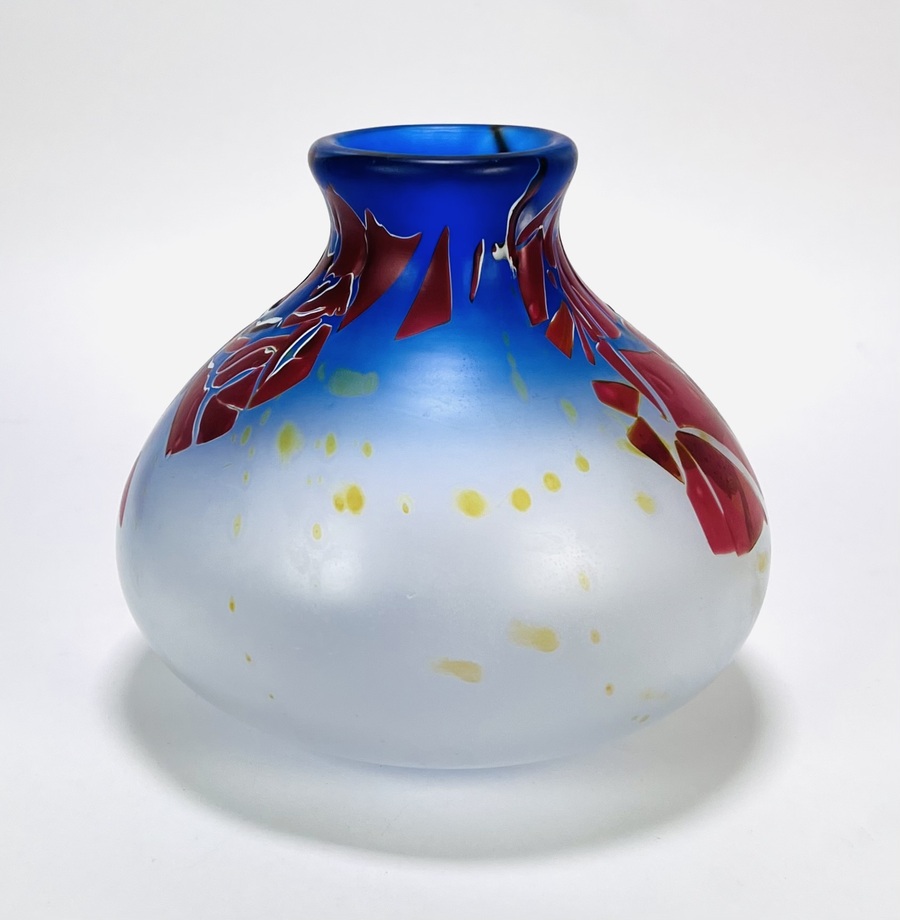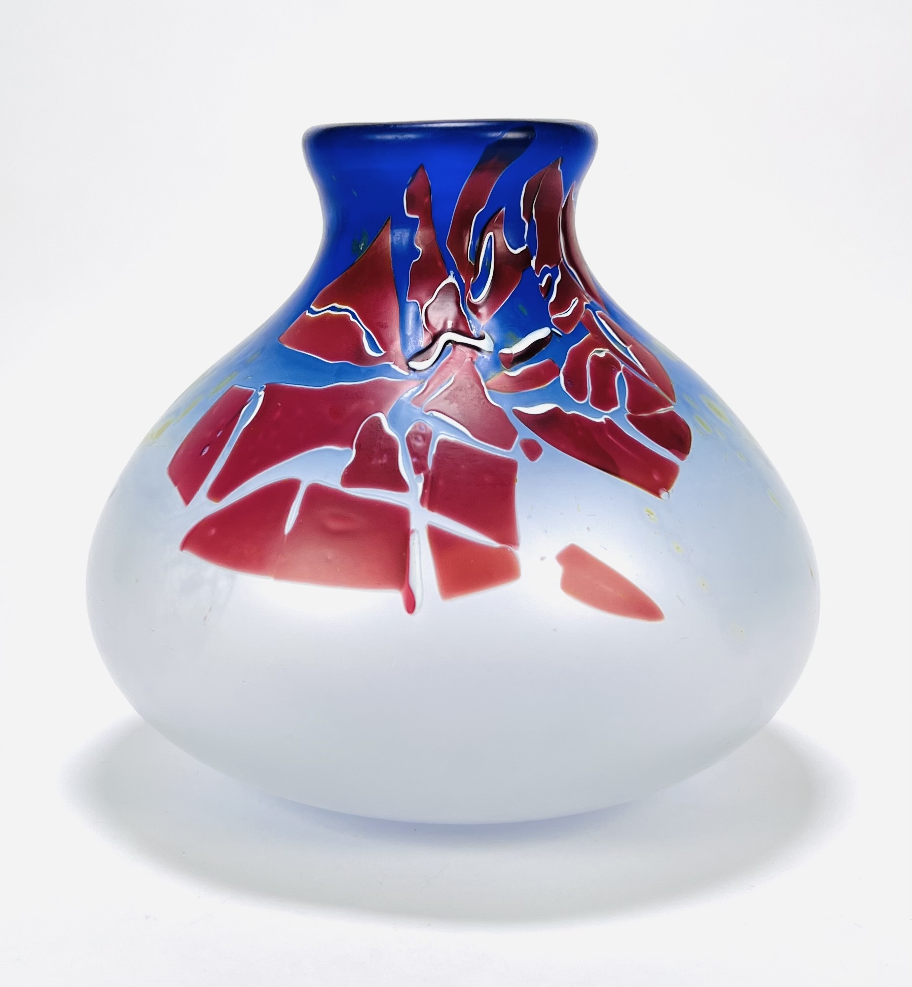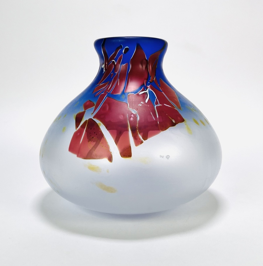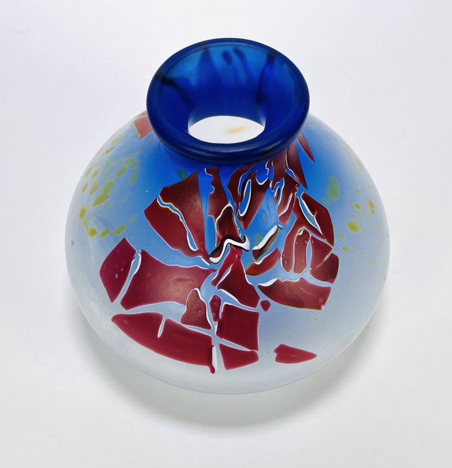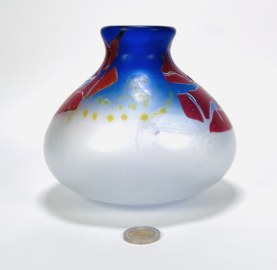 Glazen vaas uitgevoerd in modern-abstracte stijl, laatste kwart 20e eeuw. De vaas is vervaardigd in geblazen glas met ingevoegde en versmolten fragmentvormige decoraties in rood, geel en blauw. De buitenzijde toont een deels gematteerde afwerking. Onderzijde gepolijst en onduidelijk gesigneerd. Ontdek deze vaas en voeg het toe aan jouw collectie! Registreer nu voor de veiling. |