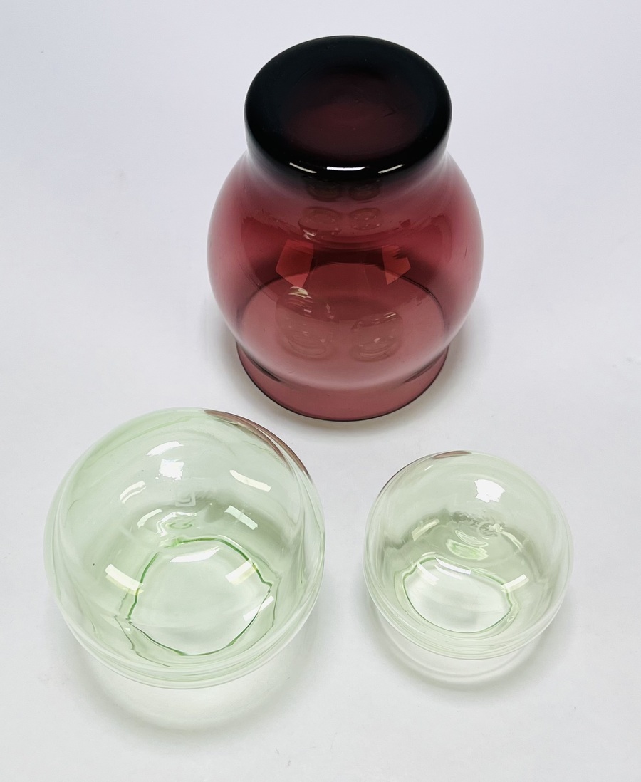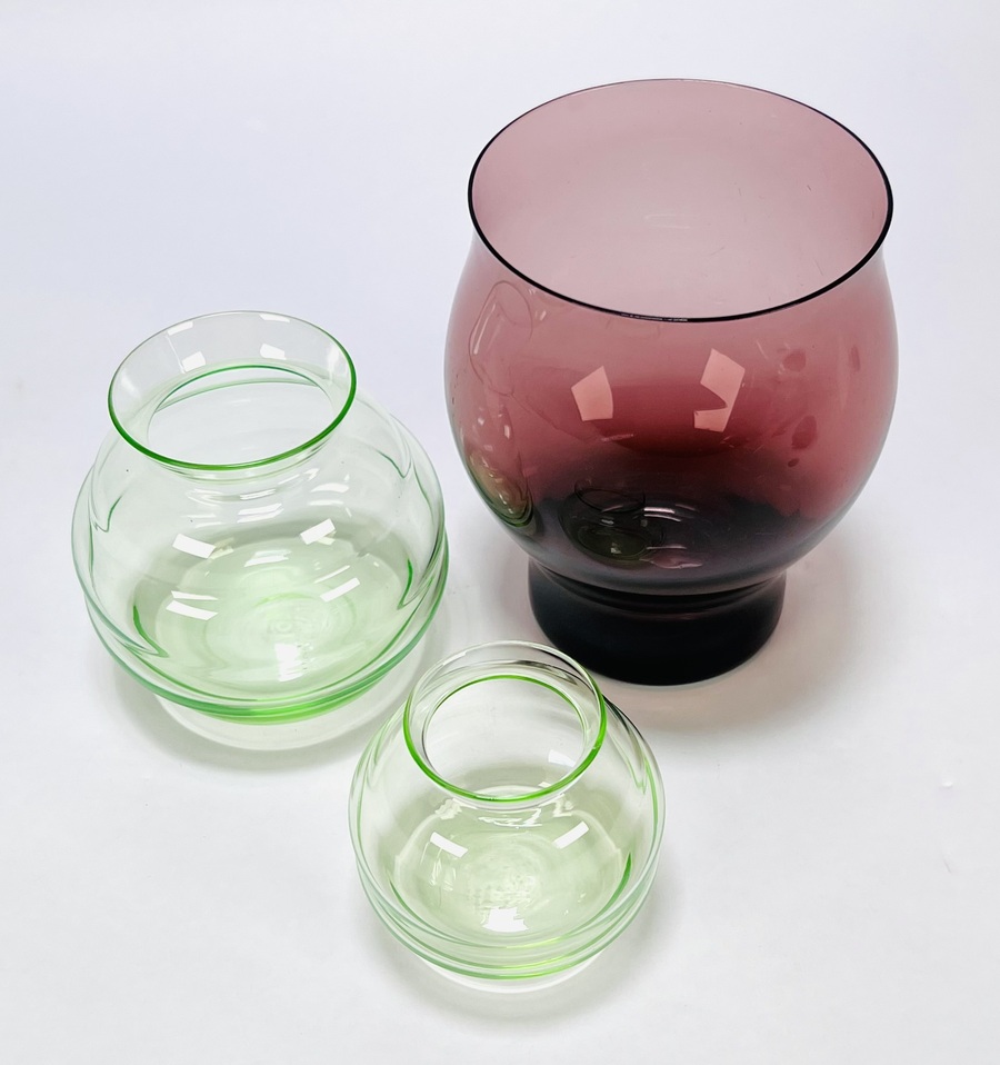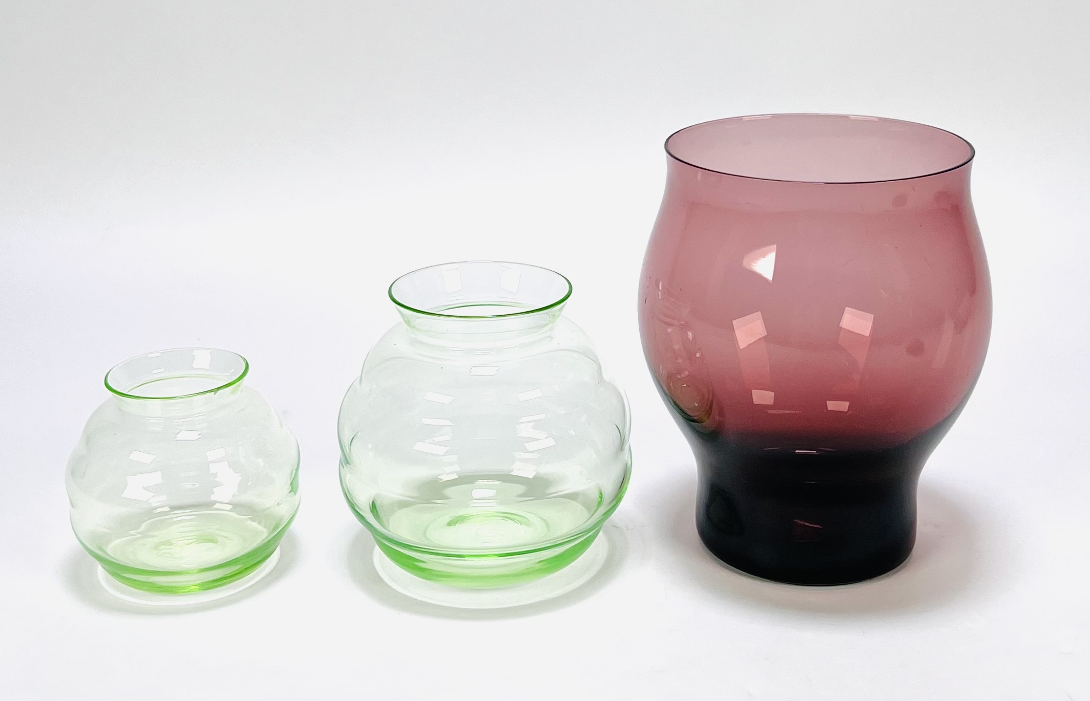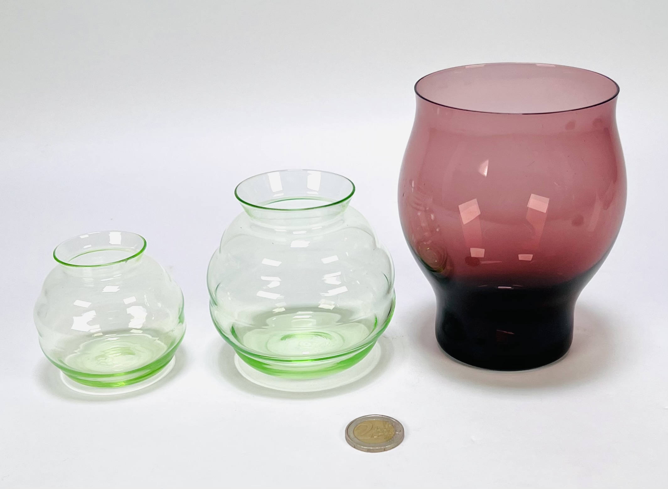Drie vaasje uit de jaren '30 uitgevoerd door Glasfabriek Leerdam. Paars vaasje ontwerp C. de Lorm, onderzijde etsmerk. De annagroene vaasjes ontwerp A.D. Copier in 1923, met een ribbelstructuur en fluoresceren groen onder uv-licht, onderzijde etsmerk. Word de volgende eigenaar van dit vaasjes, Glasfabriek Leerdam! Registreer en bied live of online! |