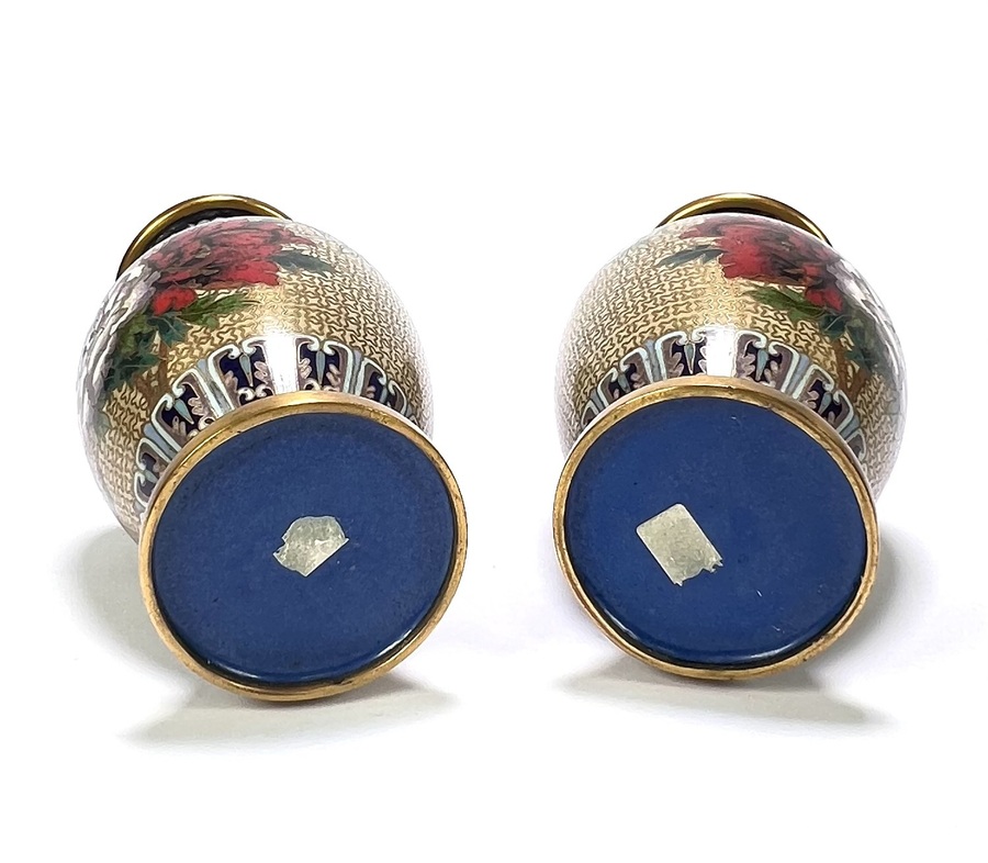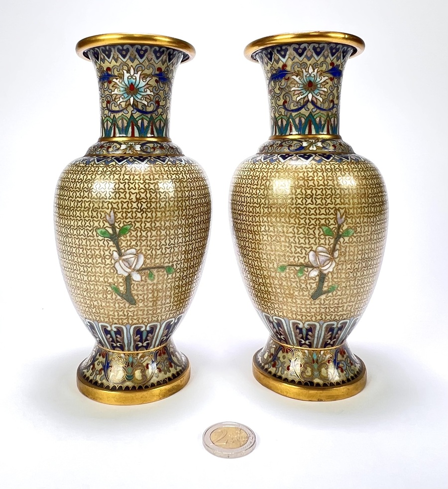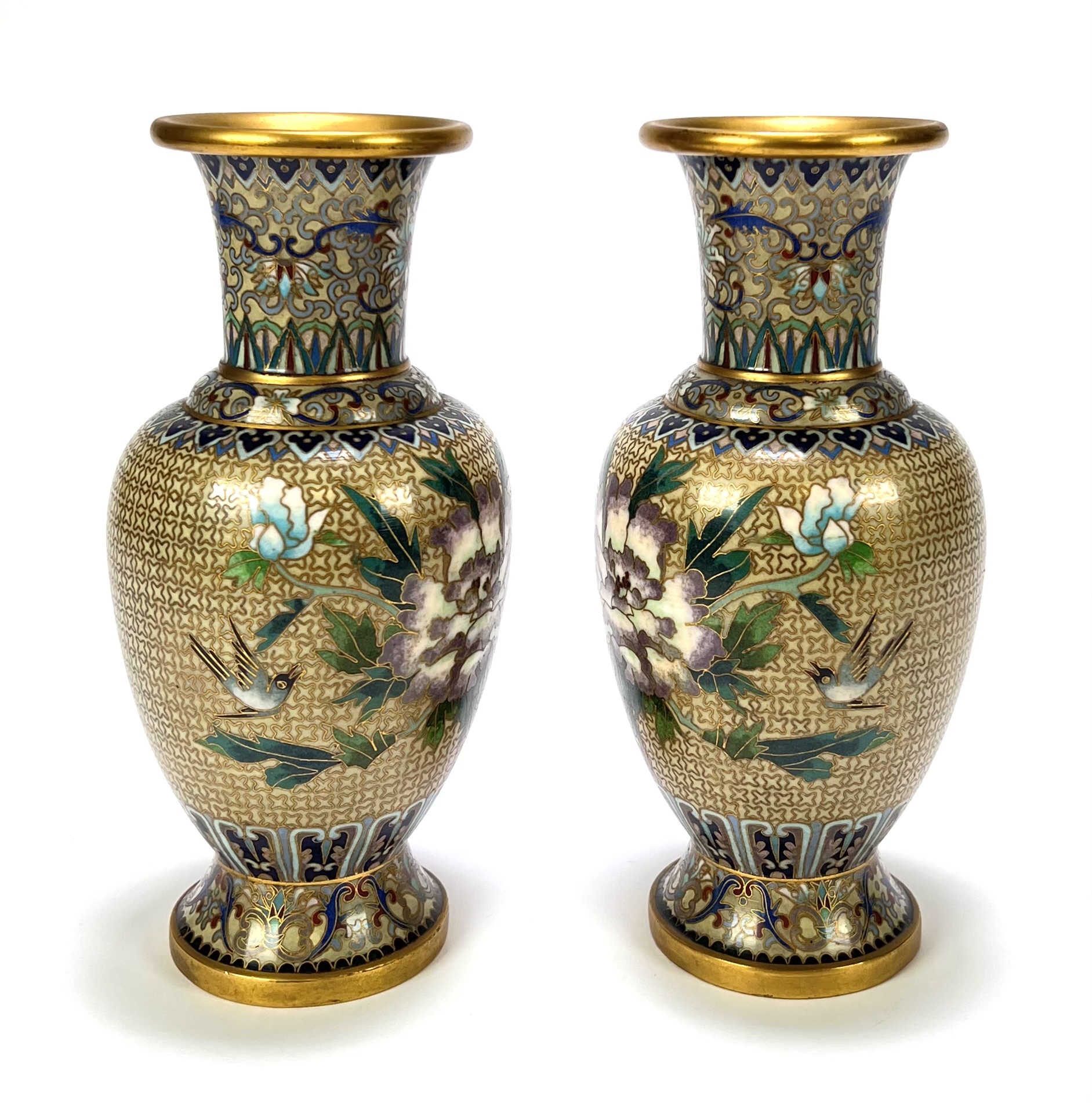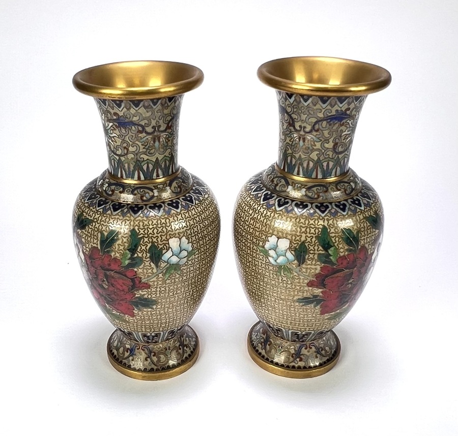 Chinese cloisonné vazen, circa midden 20e eeuw, vervaardigd uit messing met polychroom emaille. Uitgevoerd in fijn draadwerk met goudkleurige kruispatronen, florale motieven met pioenen in rood, wit en paars, witblauwe bloemen en vogels in vlucht. Afgewerkt met decoratieve banden aan voet en hals in traditioneel ornament. Wil je deze vazen in het echt bekijken? Kom naar de kijkdagen op 29, 30 en 31 augustus! |