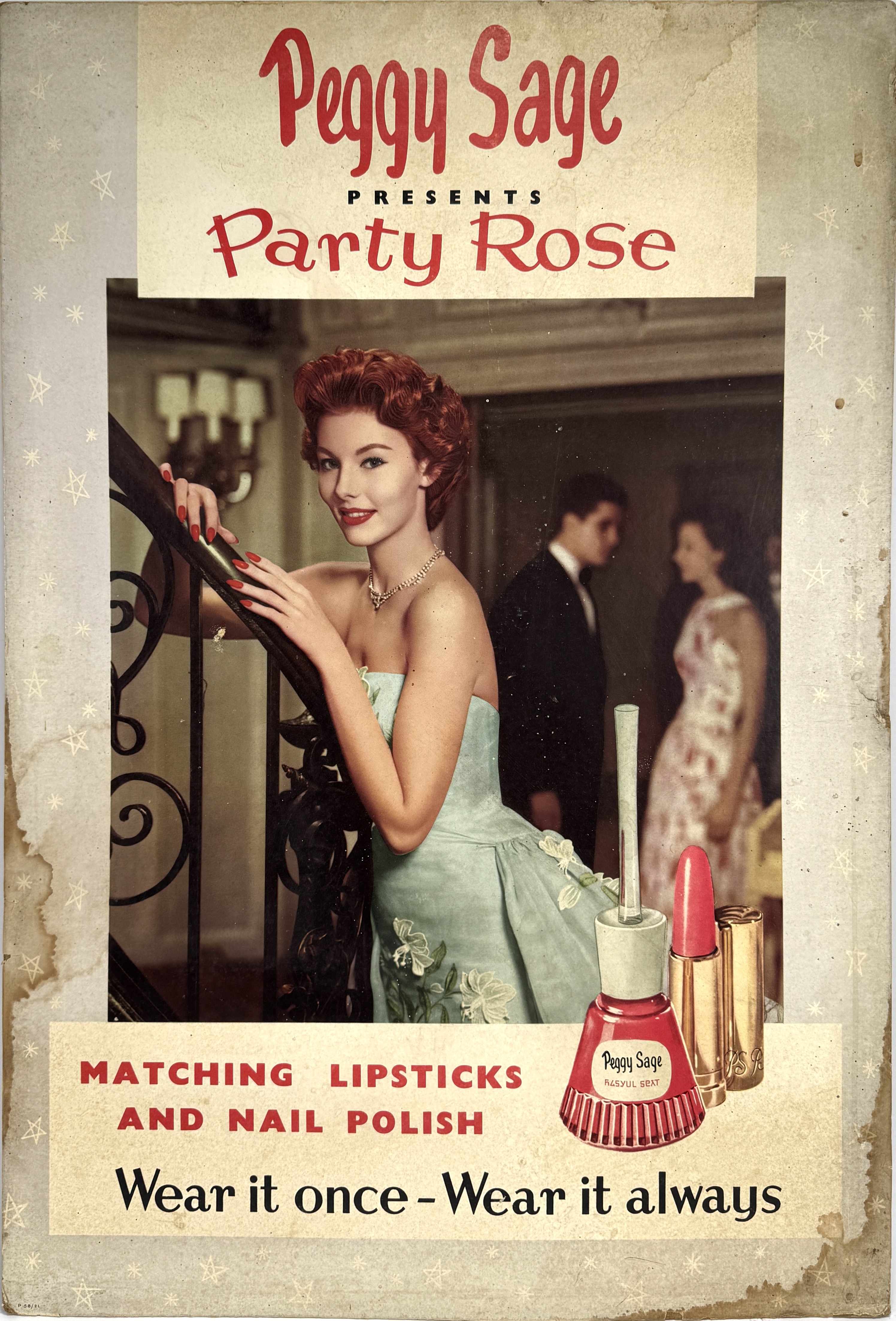 Vintage reclamebord, Peggy Sage lipstick, ca. 1950, Verenigde Staten