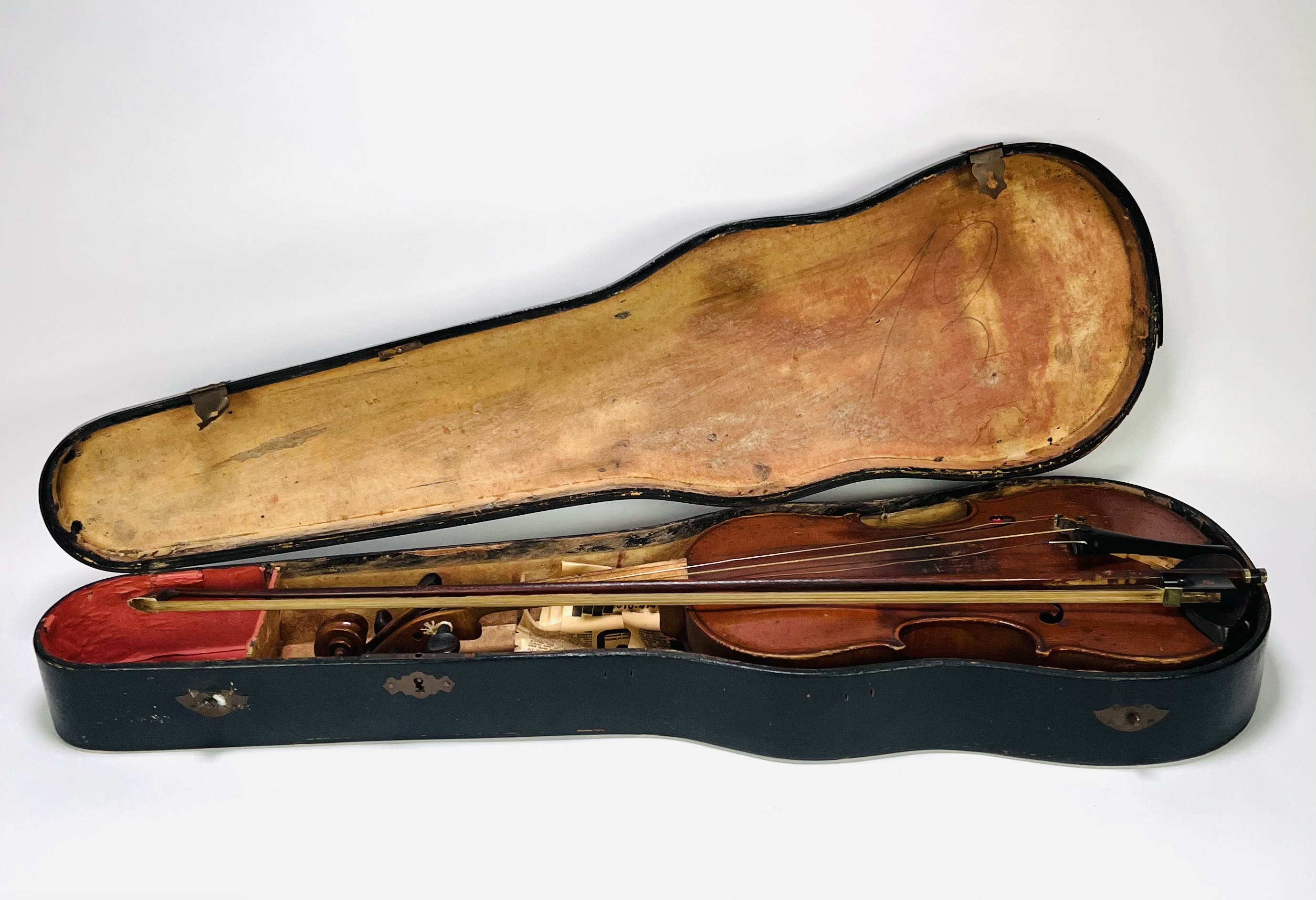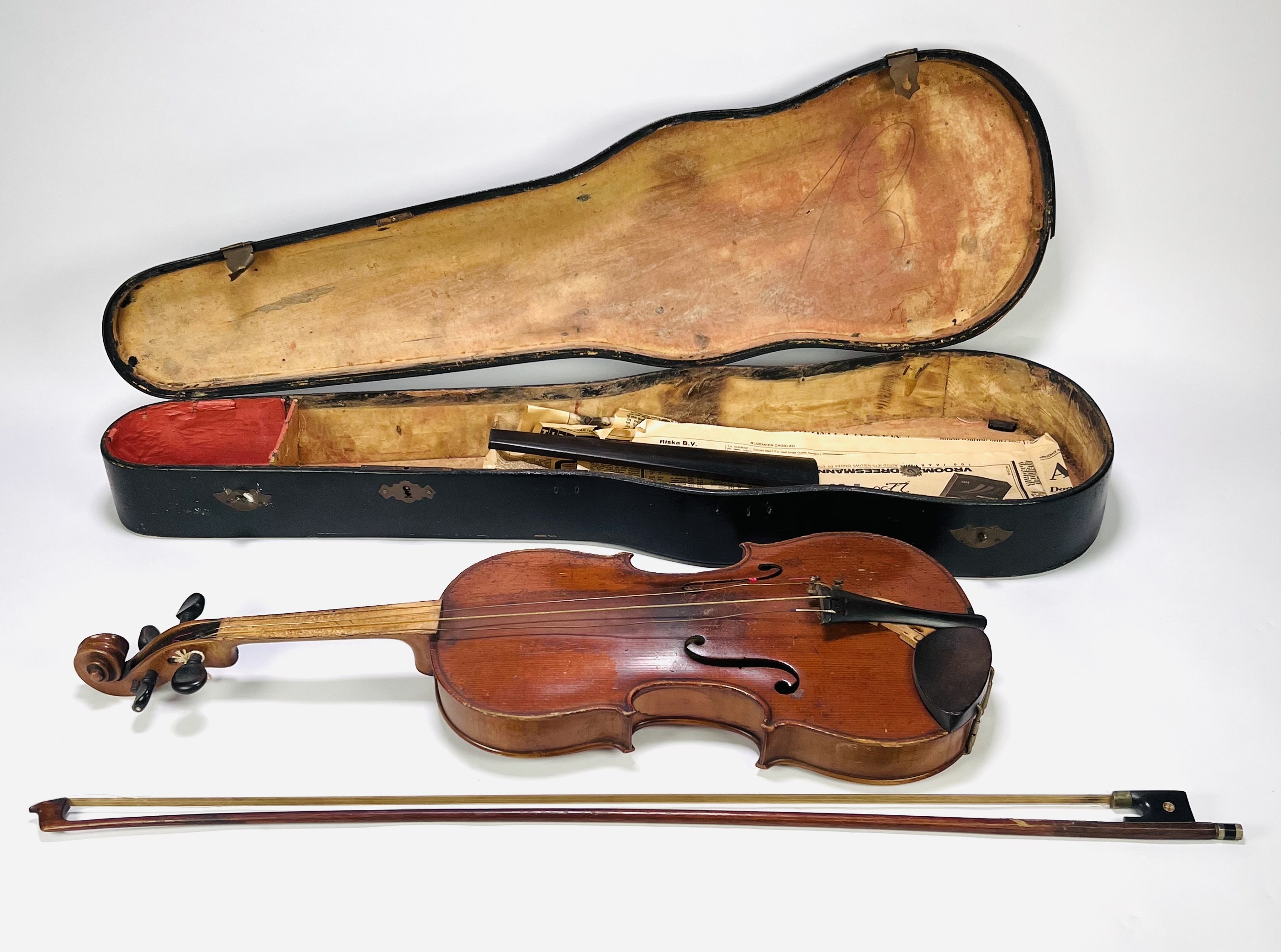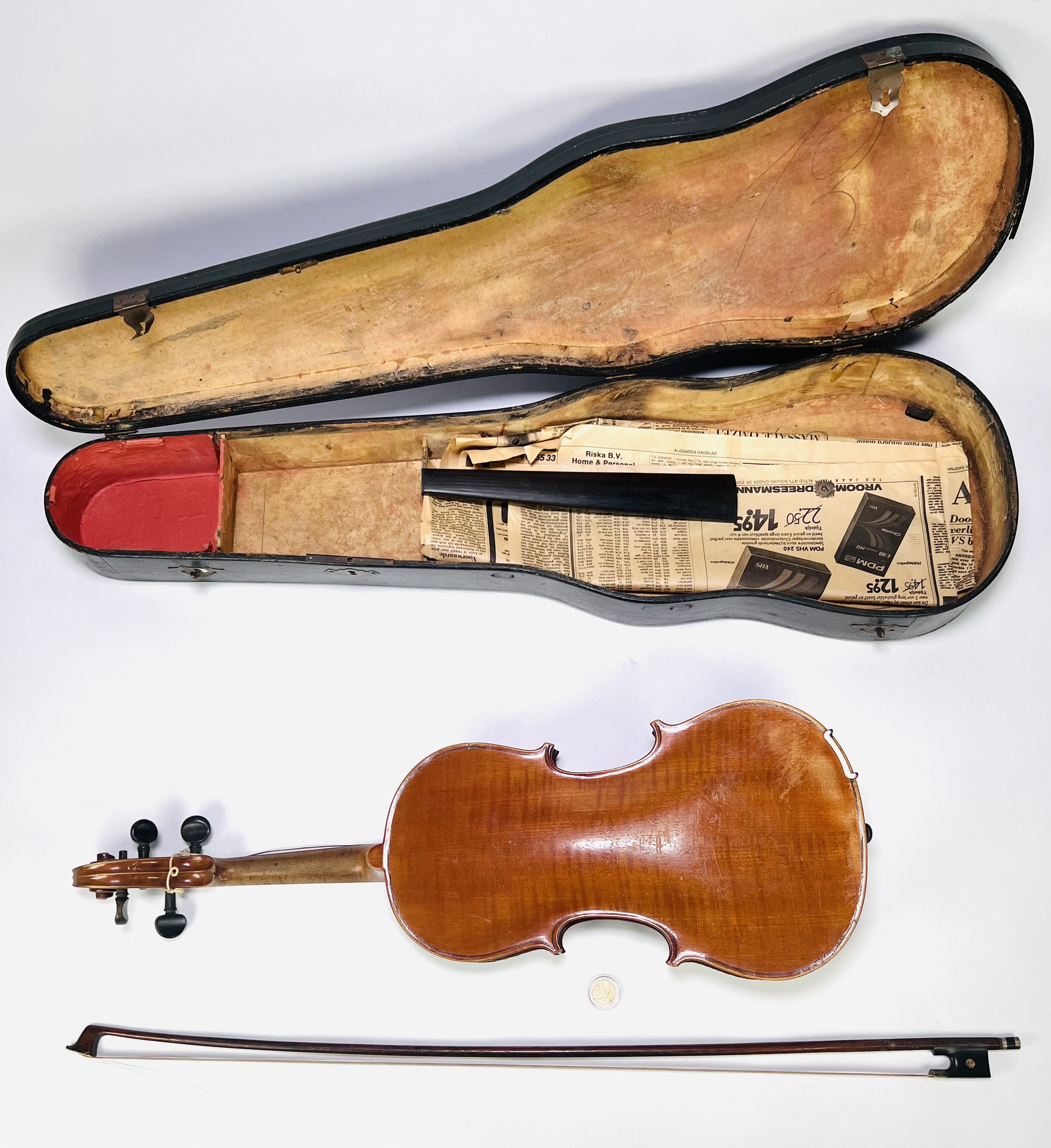 Houten viool met strijkstok in koffer, ca. 1950–1960