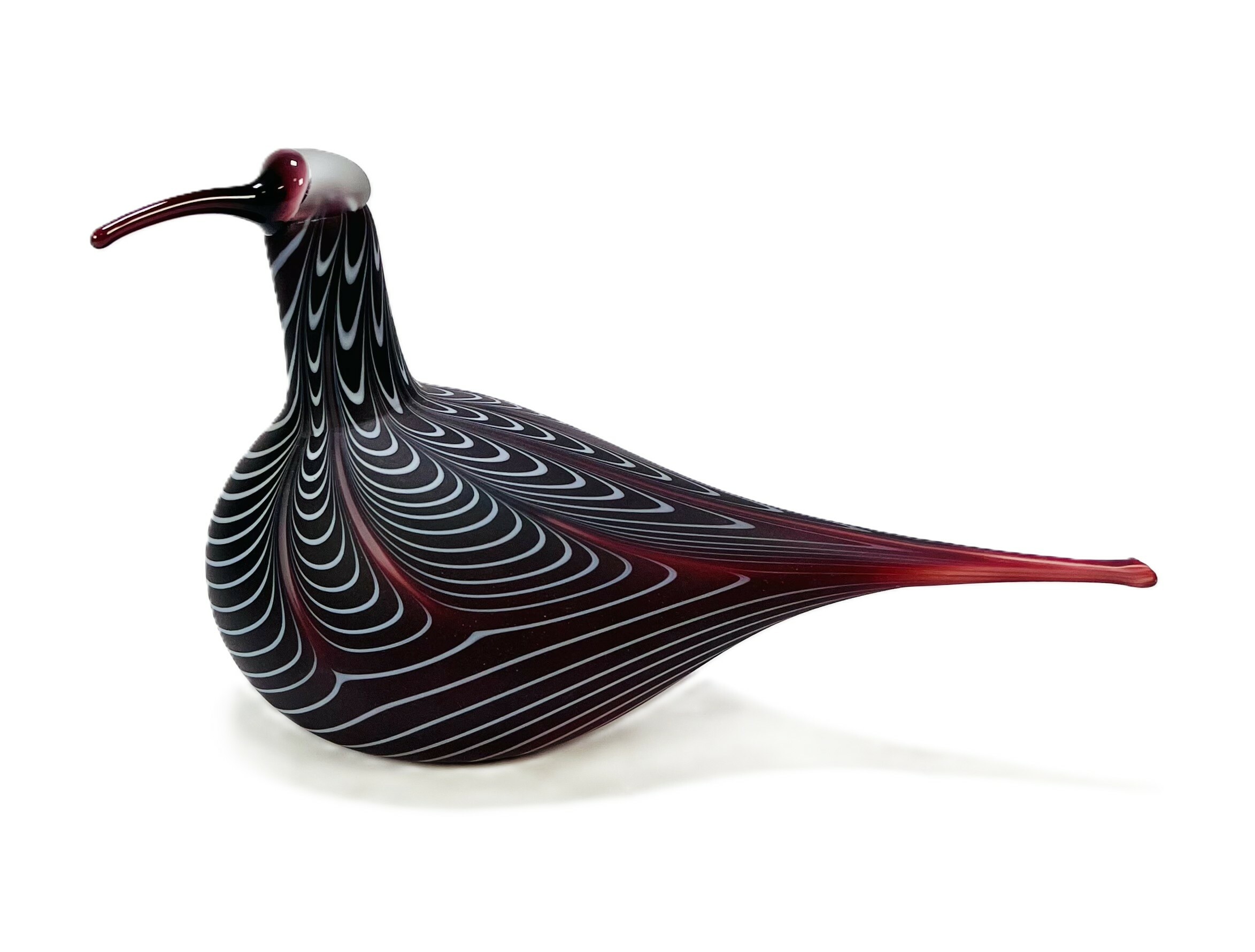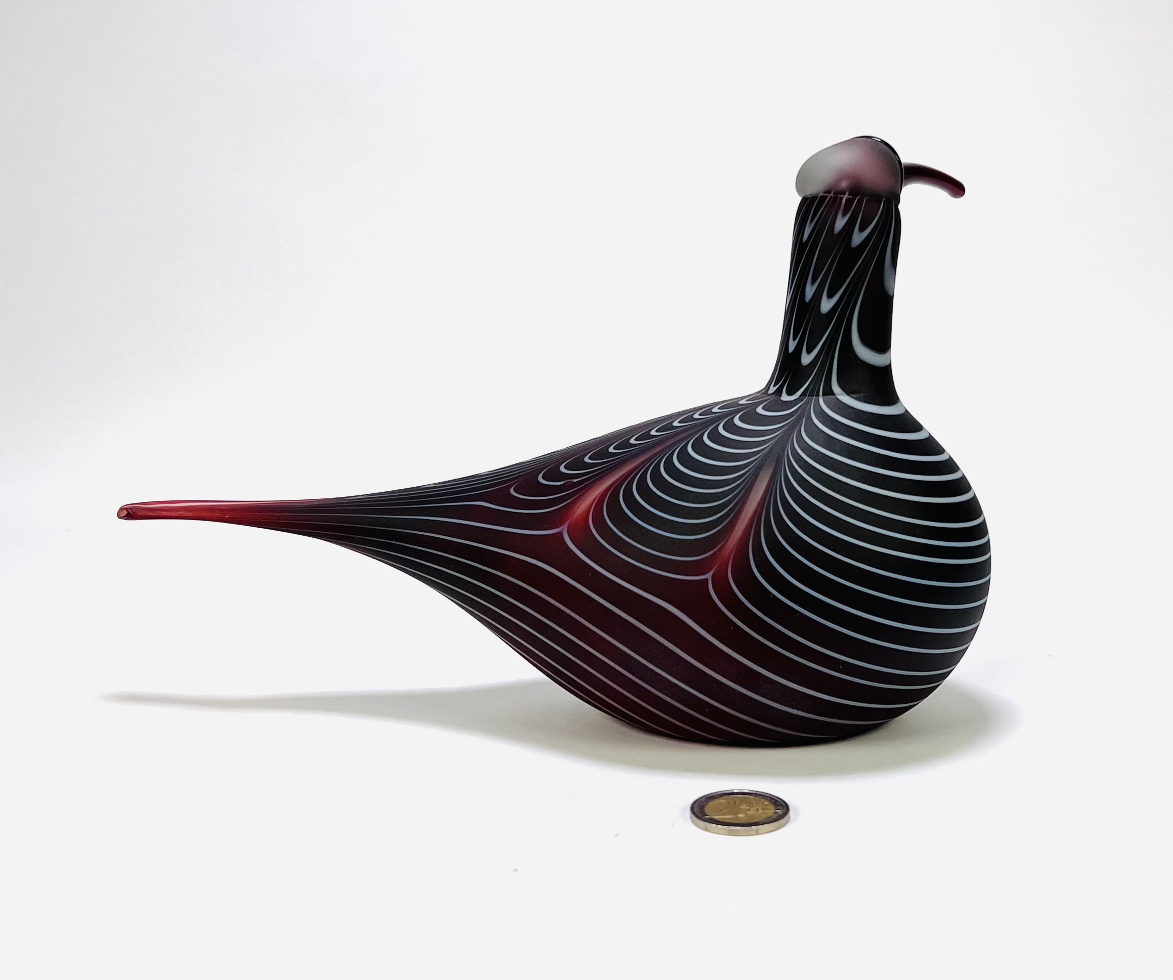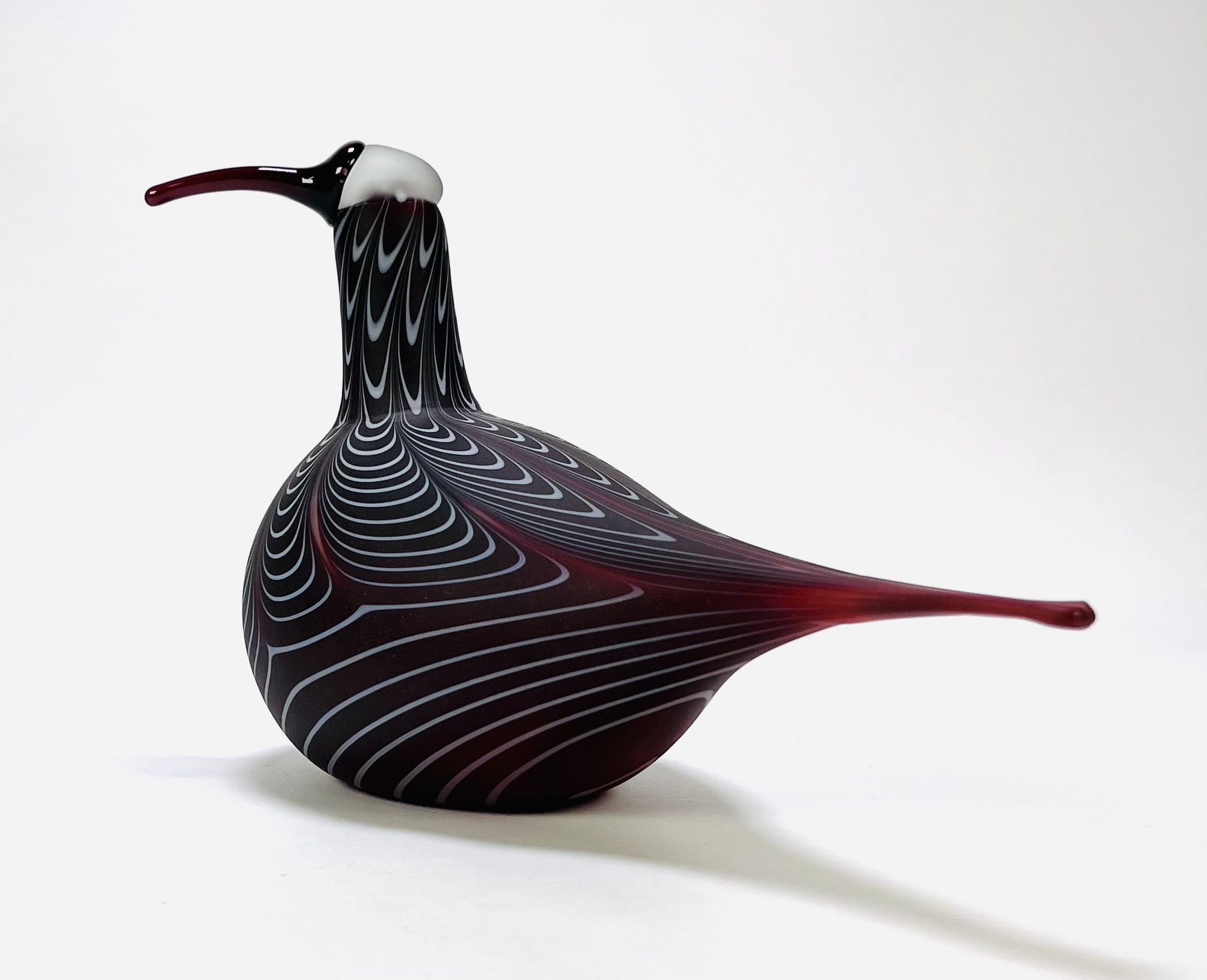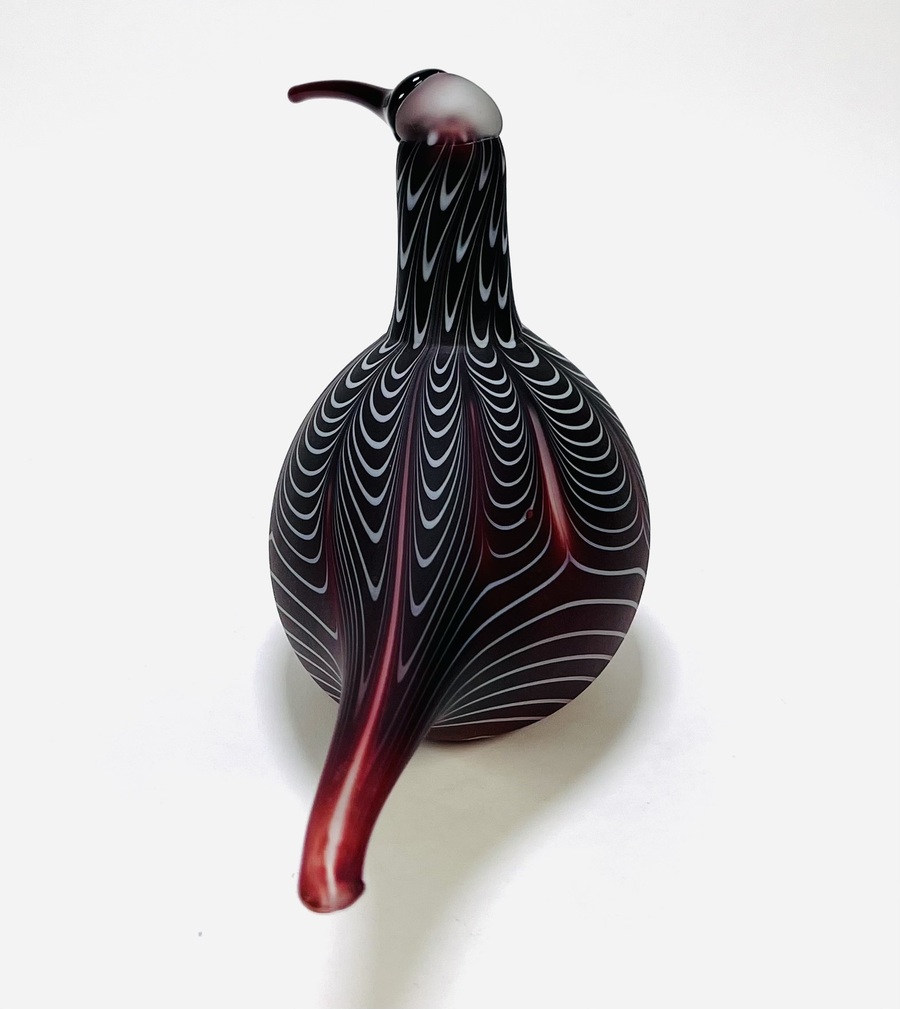 Glazen vogel ontworpen door Oiva Toikka (1931–2019), vervaardigd omstreeks 1990 voor Iittala/Nuutajärvi. Handgeblazen in bordeauxrood glas met ingelegde witte lijnen, matte body en glanzende kop en snavel. Onderaanzicht met gegraveerde signatuur “O. Toikka Nuutajärvi”, zijkant met Iittala-label. De sculpturale vorm en decoratie van de wulp zijn kenmerkend voor Scandinavisch design uit deze periode. Dit glazen vogel zelf beoordelen? Je bent welkom op onze kijkdagen op 29, 30 en 31 augustus! |