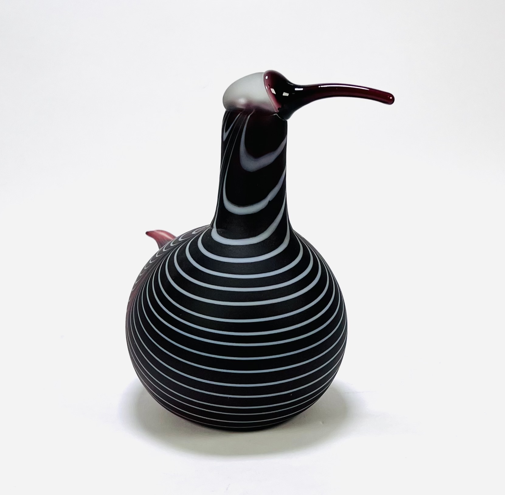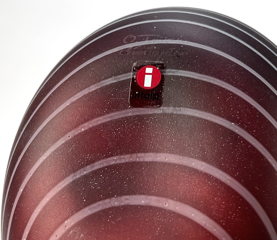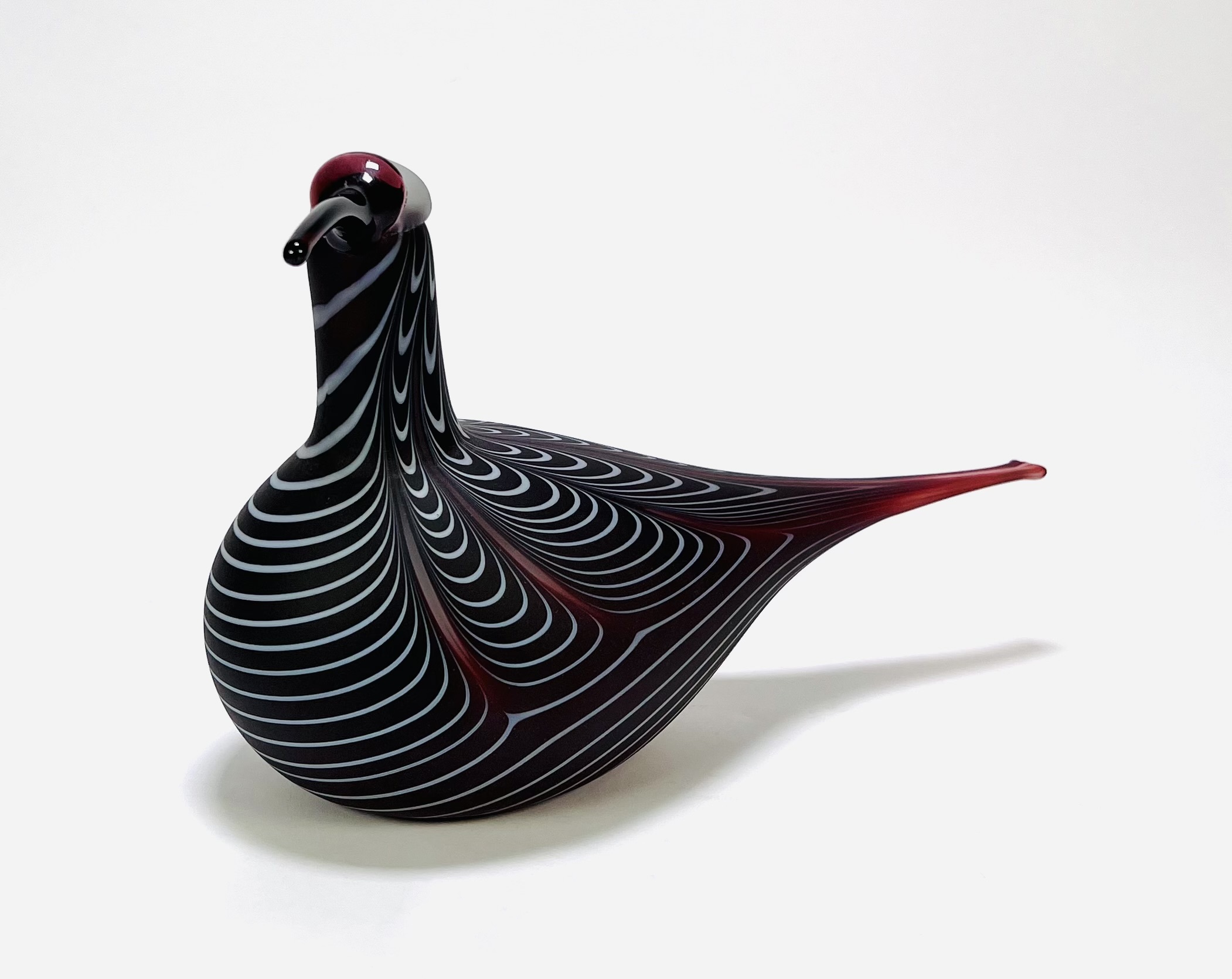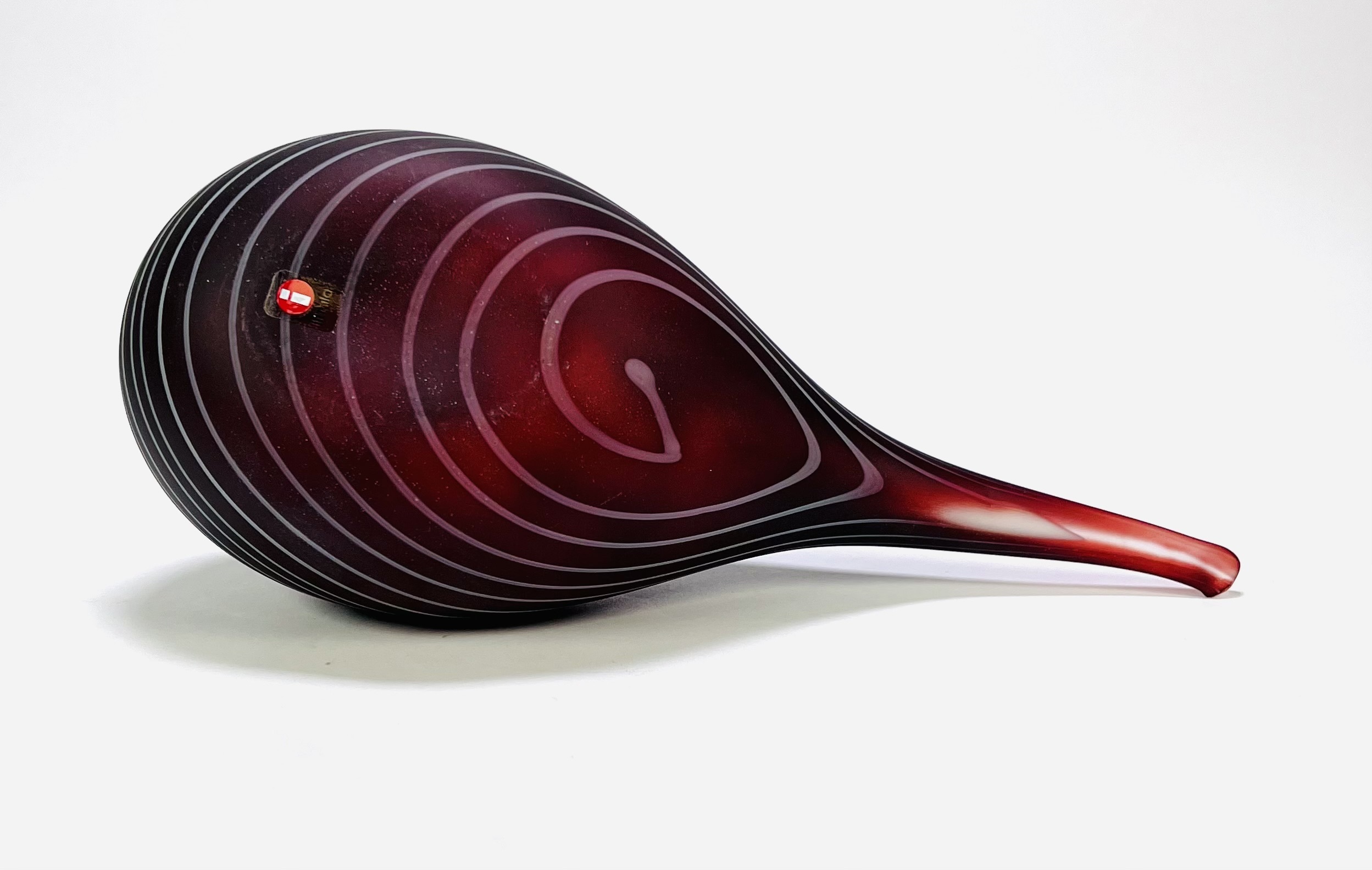 Glazen vogel ontworpen door Oiva Toikka (1931–2019), vervaardigd omstreeks 1990 voor Iittala/Nuutajärvi. Handgeblazen in bordeauxrood glas met ingelegde witte lijnen, matte body en glanzende kop en snavel. Onderaanzicht met gegraveerde signatuur “O. Toikka Nuutajärvi”, zijkant met Iittala-label. De sculpturale vorm en decoratie van de wulp zijn kenmerkend voor Scandinavisch design uit deze periode. Dit glazen vogel zelf beoordelen? Je bent welkom op onze kijkdagen op 29, 30 en 31 augustus! |