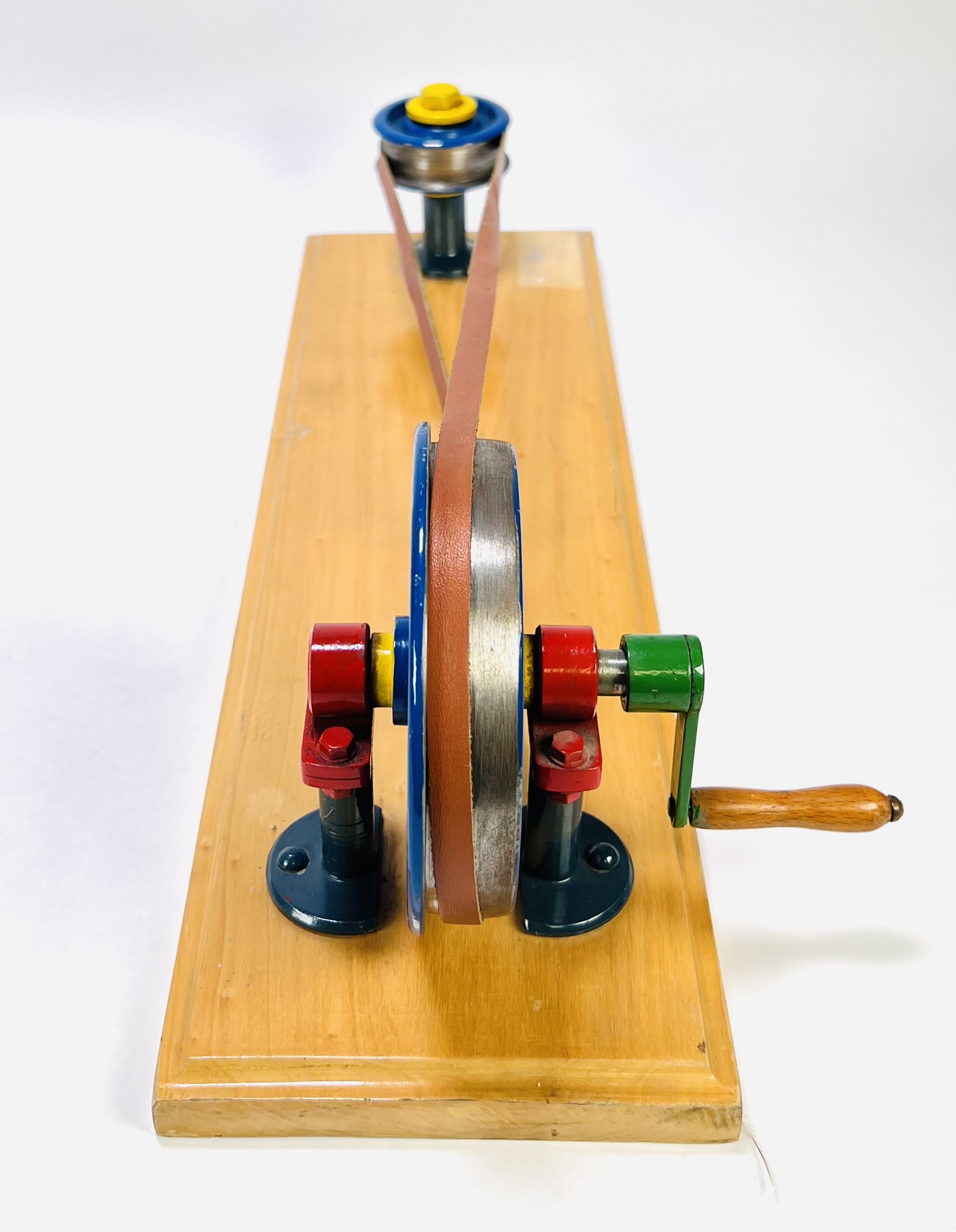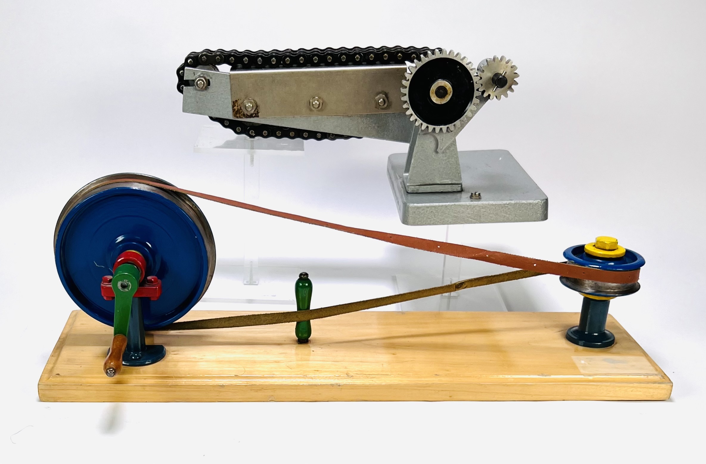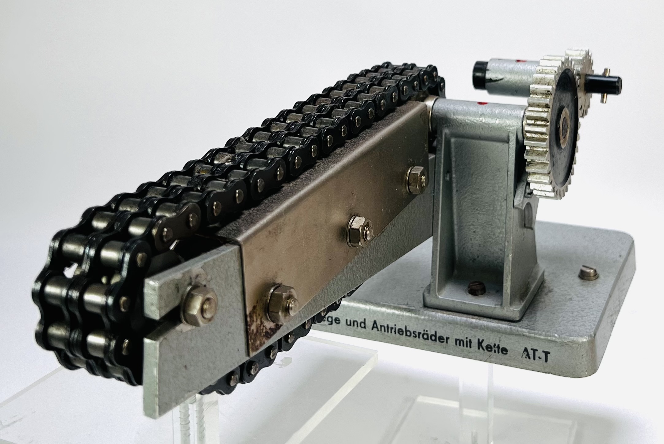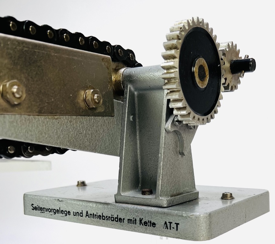 Technische demonstratiemodellen, midden 20e eeuw. Eén model met dubbelrolketting en tandwielen, op voetplaat gemerkt rechts: “Seitenvorgelege und Antriebsräder mit Kette AT.T”. Tweede model met handkruk, groot vliegwiel, poelies en vlakke riem. Gietaluminium/gietijzer, stalen onderdelen, houten sokkel, gelakt/emaille. Didactische, industriële stijl voor onderwijs over ketting- en riemaandrijving. Zeker zijn van deelname? Plaats vanaf 22 augustus een schriftelijk bod online! |