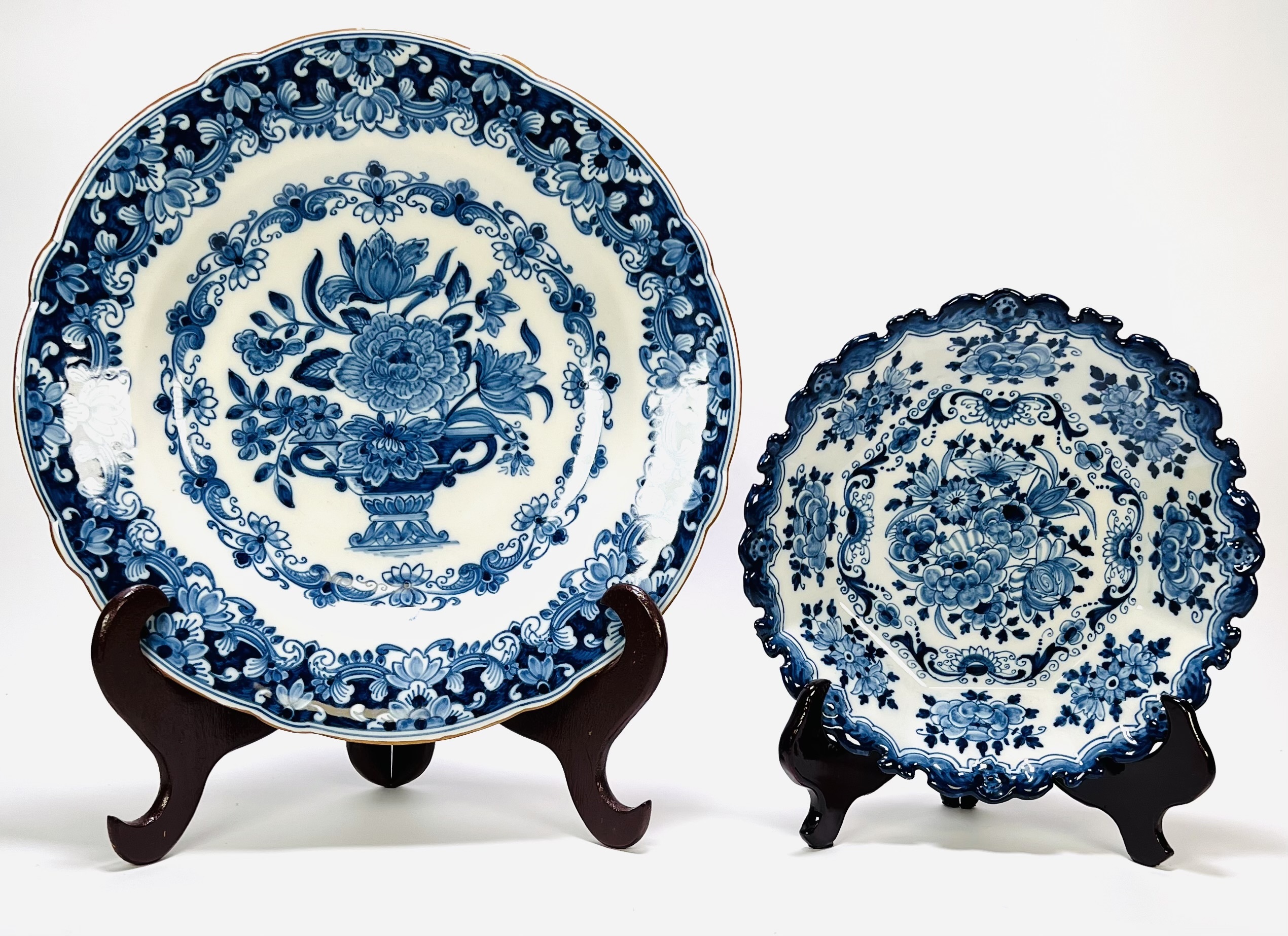 Twee wandborden door Tichelaar Makkum, aardewerk met tinglazuur, vervaardigd op 18 april 1967. Handbeschilderd in kobaltblauw op witte ondergrond in Delfts blauwe traditie. Het ene bord toont een bloemboeket in vaas met ornamentale rand, het andere samengestelde bloemenranken in rocaille-omlijsting. Beide voorzien van de inscriptie “Makkum, 18/4/67” aan de achterzijde. Registreer nu en bied eenvoudig online mee op deze wandborden! |