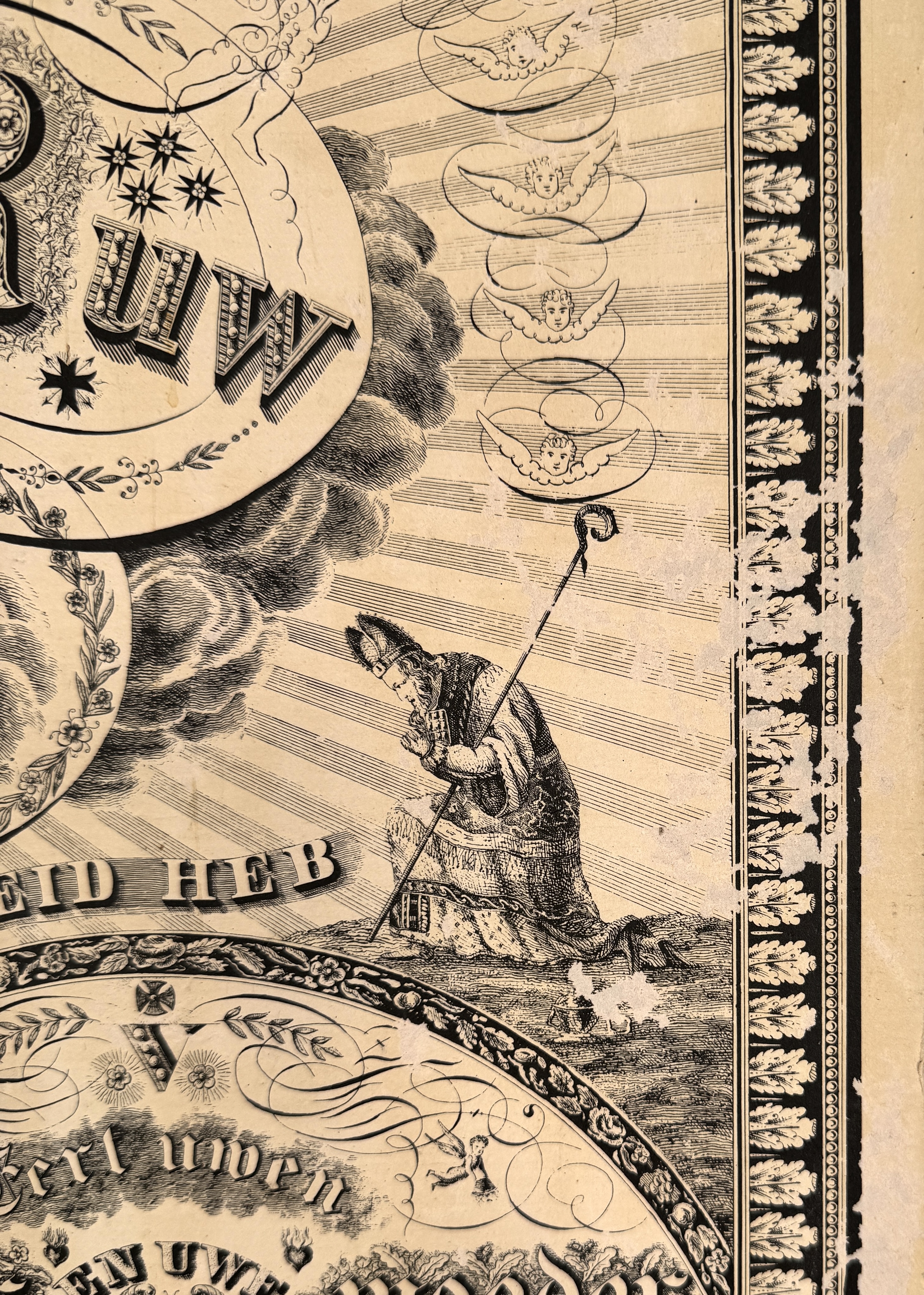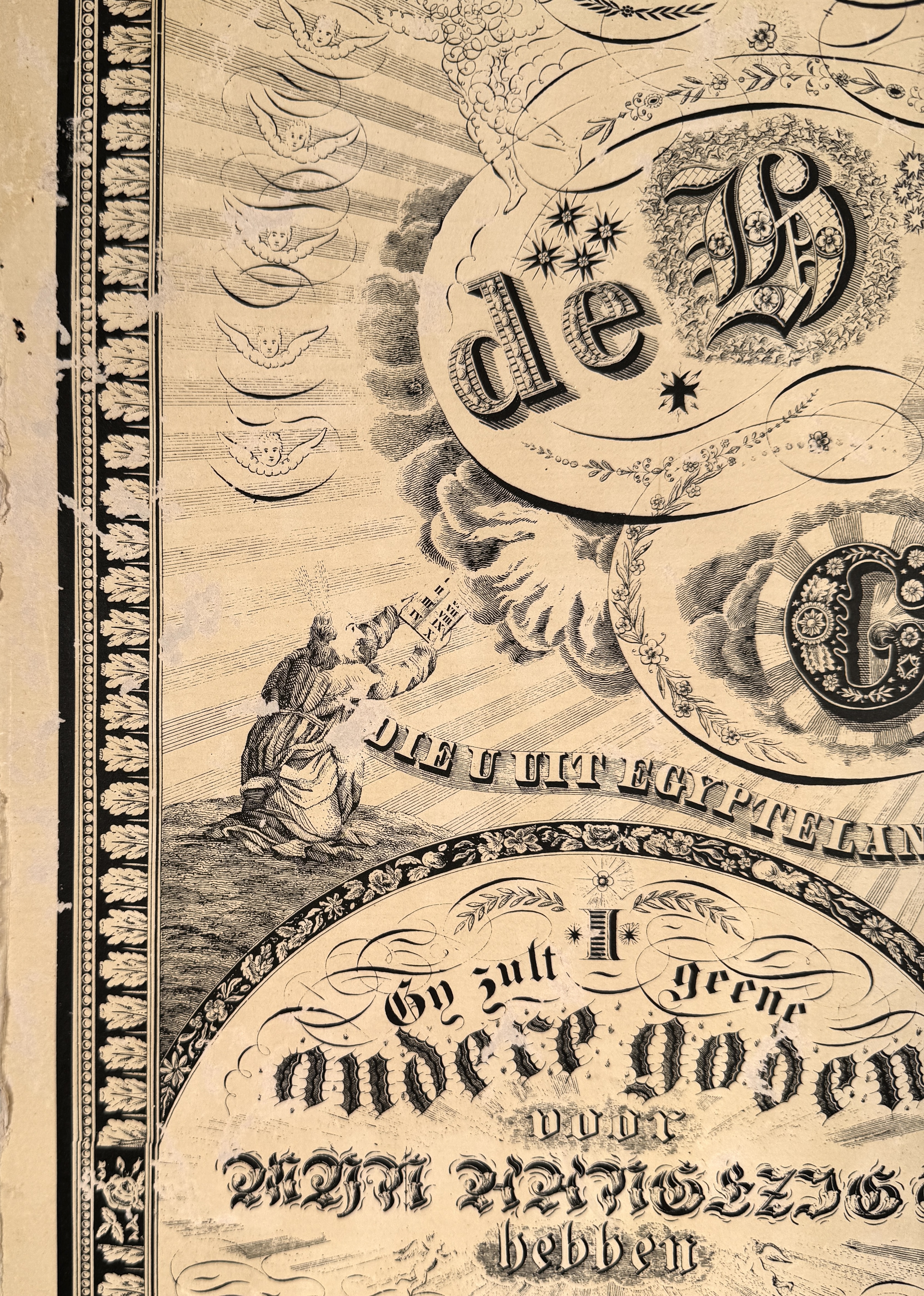 Religieuze litho op board, in neoclassicistische stijl met barokke invloeden, omstreeks midden 19e eeuw. De voorstelling bevat de Tien Geboden in rijk uitgewerkte typografie, omringd door wolken en allegorische figuren met staf en kerkmodel. Het werk illustreert Bijbelse wetten en diende vermoedelijk als didactisch en devotioneel object voor huiselijk of kerkelijk gebruik. Wil je de litho in het echt bekijken? Kom naar de kijkdagen op 29, 30 en 31 augustus! |