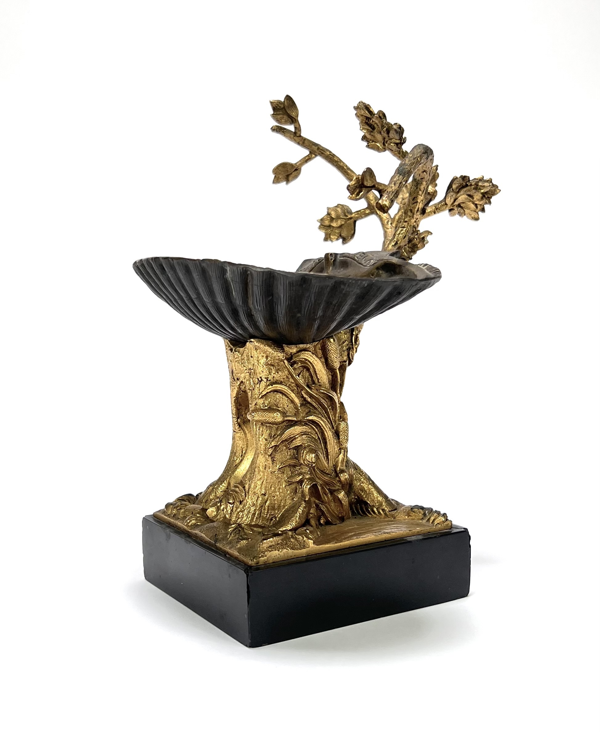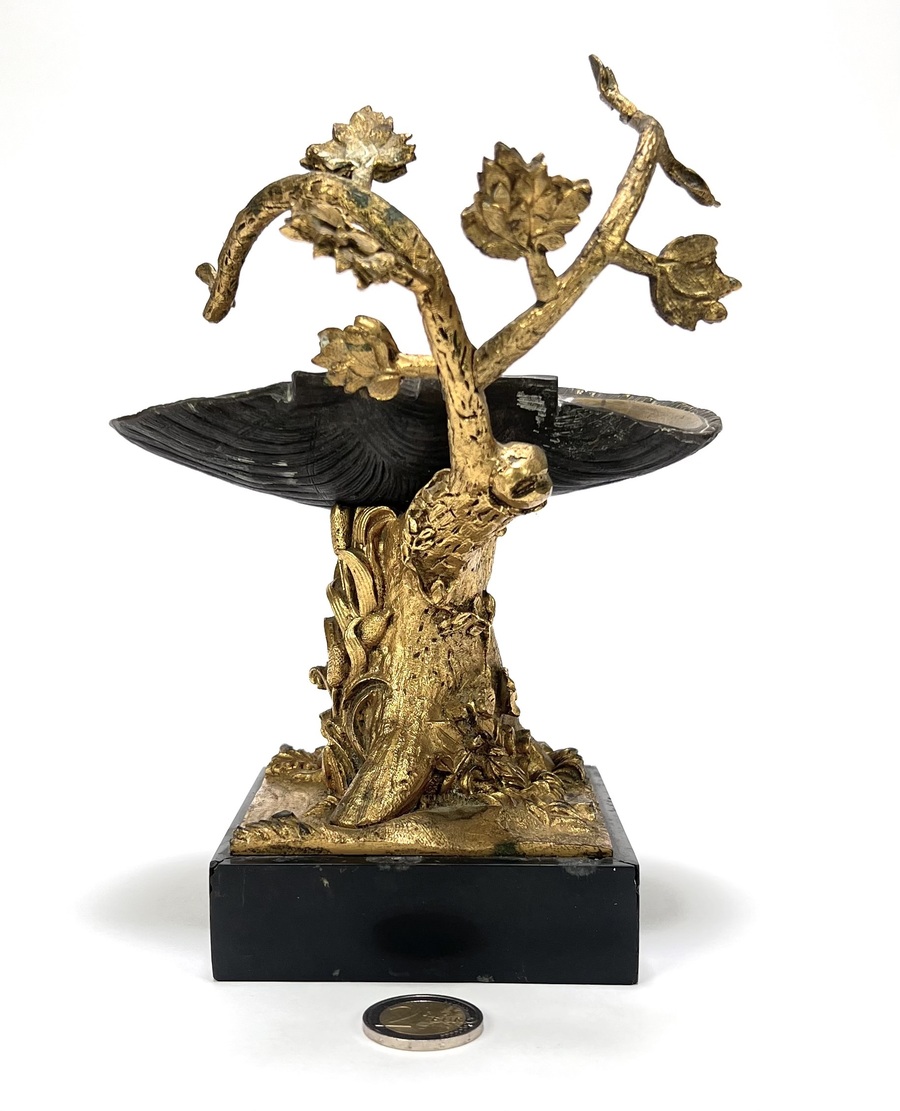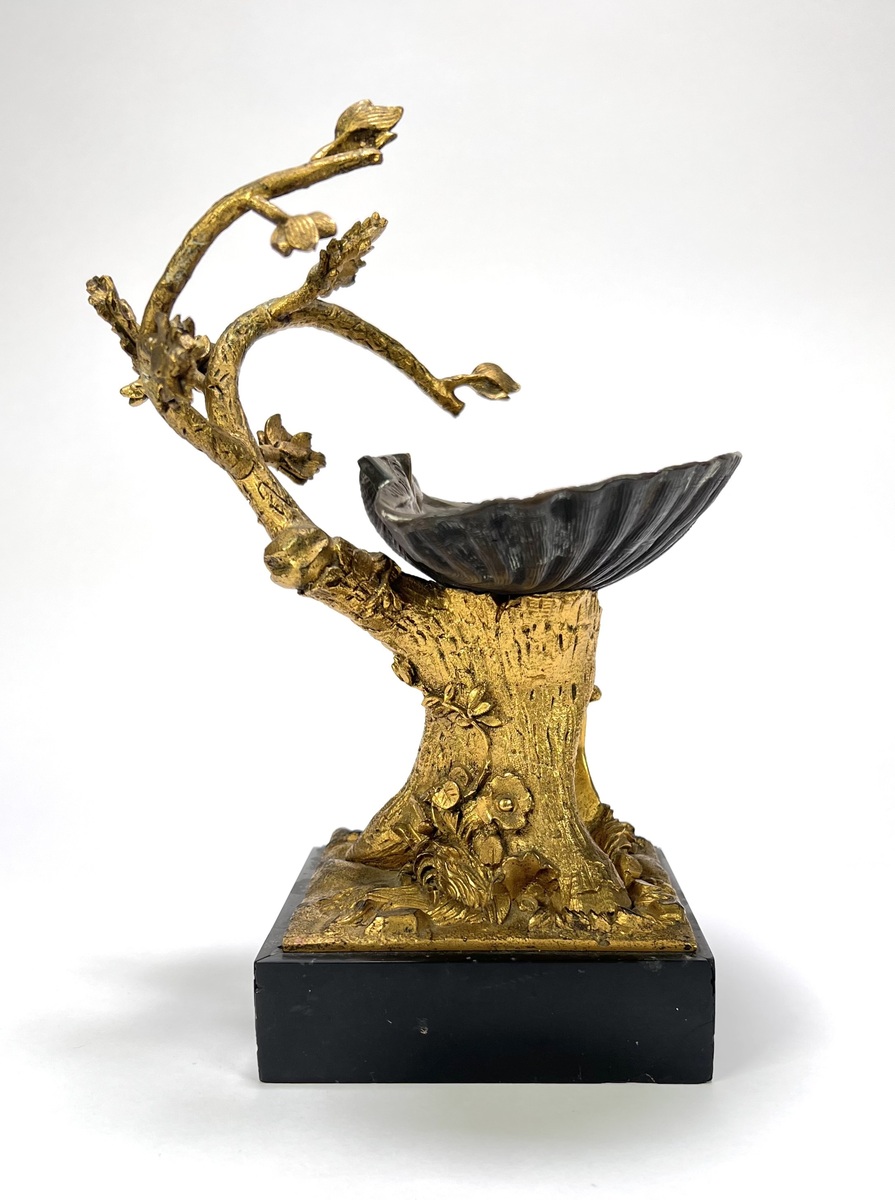 Wijwaterbakje in Napoléon III-stijl, omstreeks 1870–1890. Gegoten en ciselé brons/regule met vergulding, op rechthoekige marmeren sokkel. Boomstronk met takken en bladeren ondersteunt een schelp met banderol en inscriptie "Le sauveur du Monde". Devotioneel tafelobject voor wijwater in huiselijke context, voorbeeld van laat-19e-eeuwse Franse religieuze metaalwaren. Kom langs tijdens de kijkdagen (29 t/m 31 augustus) en ontdek dit wijwaterbakje zelf! |
