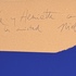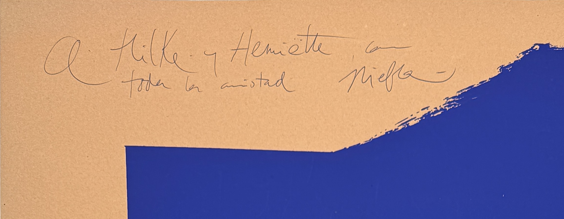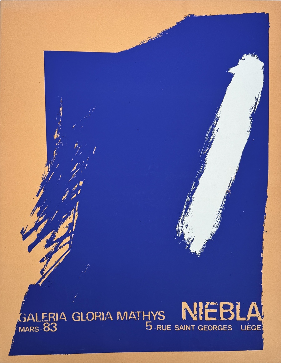Zeefdruk affiche van Niebla, maart 1983, uitgegeven ter gelegenheid van een expositie in Galeria Gloria Mathys, Luik. Uitgevoerd op papier in abstract-expressionistische stijl, met een groot blauw vlak en witte veeg op beige ondergrond. Twee exemplaren in map, waarvan één voorzien van een handgeschreven opdracht linksboven in potlood, gericht aan “Hilke y Henriette”.