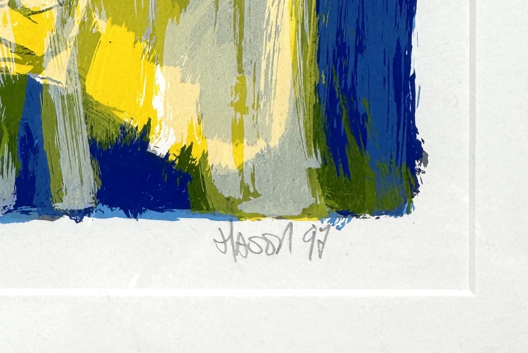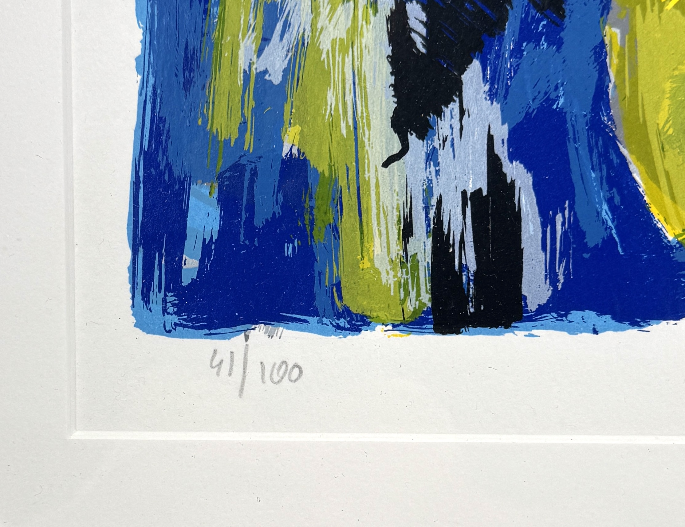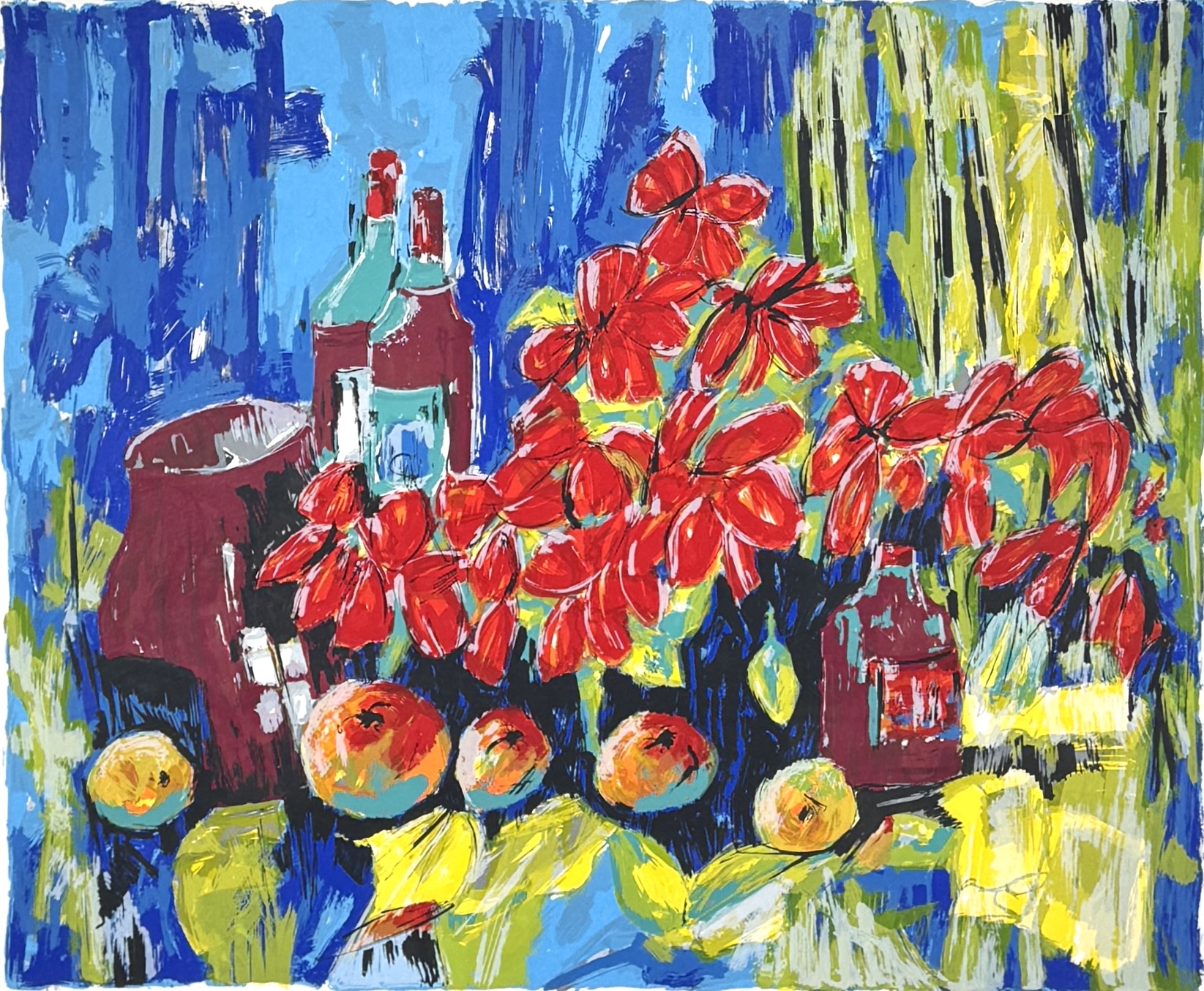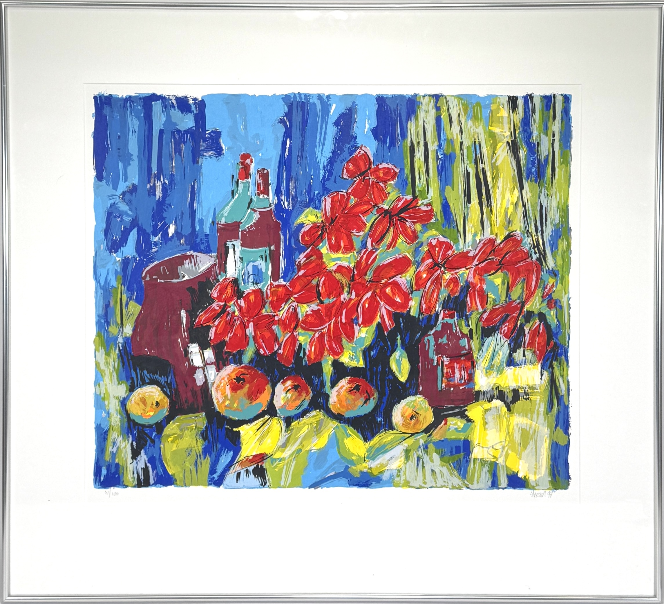 Zeefdruk, onduidelijk gesigneerd rechtsonder en gedateerd 1997, met oplagenummer 41/100 linksonder in potlood. Uitgevoerd op papier. De compositie toont een expressief bloemstilleven met rode bloemen, flessen, vruchten en een kruik, uitgevoerd in dynamische, contrasterende kleurvlakken in blauw, geel en rood. Ingelijst in zilverkleurige lijst. Deze zeefdruk zelf beoordelen? Je bent welkom op onze kijkdagen op 29, 30 en 31 augustus! |