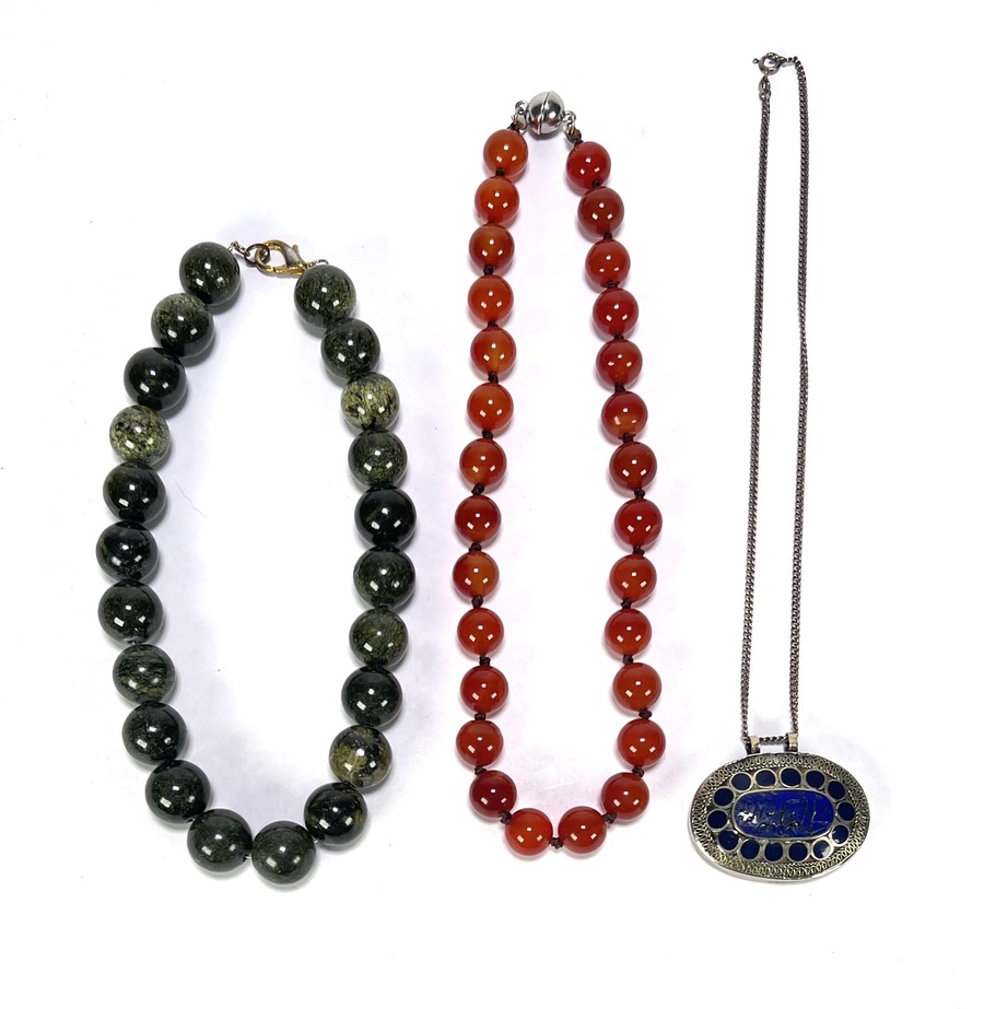 Drie halskettingen: een ketting van oranjerode carneool, een ketting van donkergroene serpentijn en een halsketting met medaillon. De medaillon is vervaardigd van zilver met filigraan en lapis lazuli en heeft een inscriptie in Arabische letters. De halskettingen dateren uit de 2e helft van de 20e eeuw.
