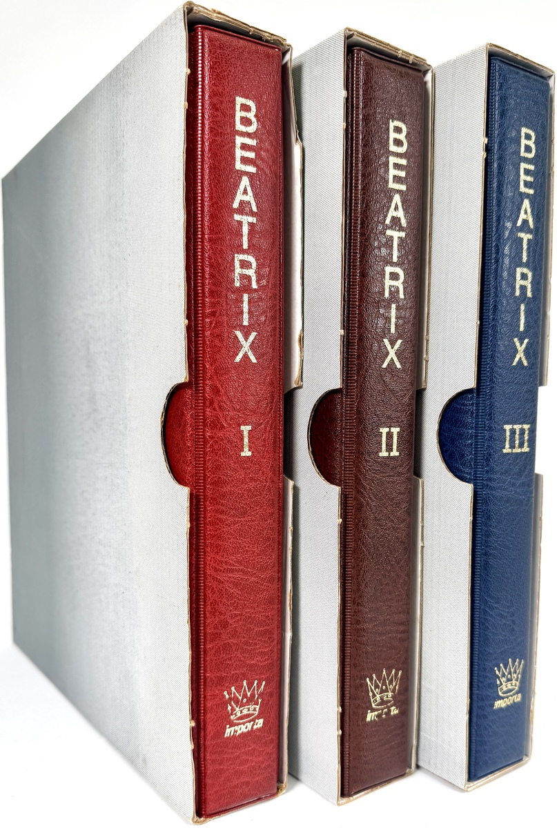 Drie bewaaralbums “Beatrix I, II, III” van Importa met Nederlandse muntensets, vervaardigd door De Nederlandse Munt, daterend uit circa 1990–1999. Uitgevoerd in nikkel, koper en messing, in machinaal geslagen munttechniek en gepresenteerd in drukwerk mappen met regionale thema’s. Volledige series guldens en euro’s in officiële muntkwaliteit.