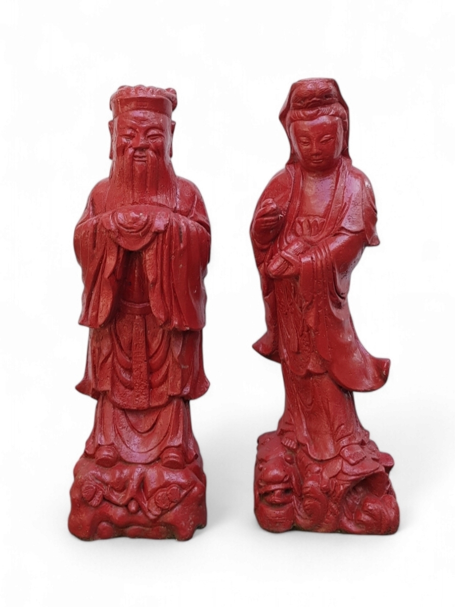 Twee Chinese beelden uit de 20e eeuw, vervaardigd uit gegoten beton met rode lakafwerking. De ene figuur toont een mannelijke verschijning met lange baard en gewaad, de andere een vrouwelijke figuur, mogelijk Guanyin, staande op een decoratieve basis. Beide zijn uitgevoerd in traditionele stijl, met nadruk op symboliek en devotioneel gebruik.