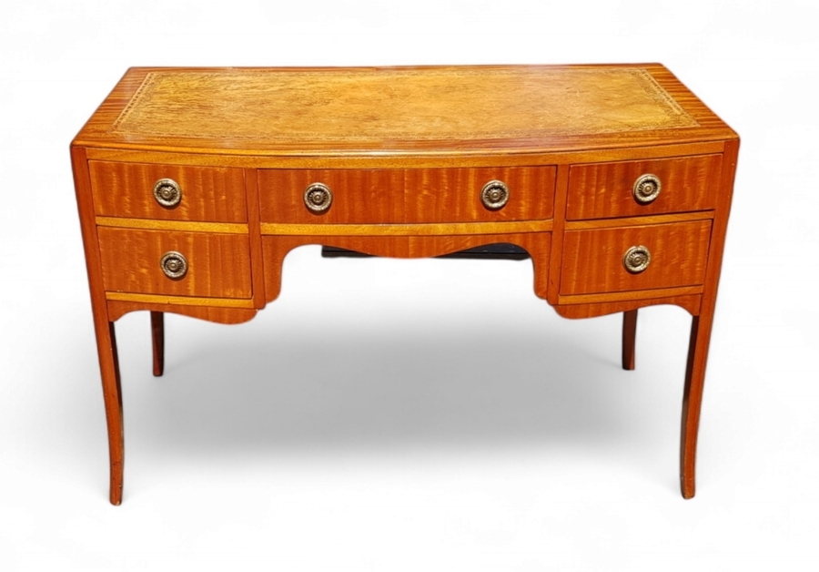 Mahonie en satinéfineer bureau in George III-stijl, omstreeks midden 20e eeuw, uitgevoerd met ingelegd leren blad en messing beslag. Het meubel heeft vijf laden met ronde messing trekknoppen, een gebogen front en slanke gebogen poten. Warme gevlamde houtstructuur en de symmetrische indeling van het front, passend binnen de klassieke traditie van Engels geïnspireerde meubelkunst.