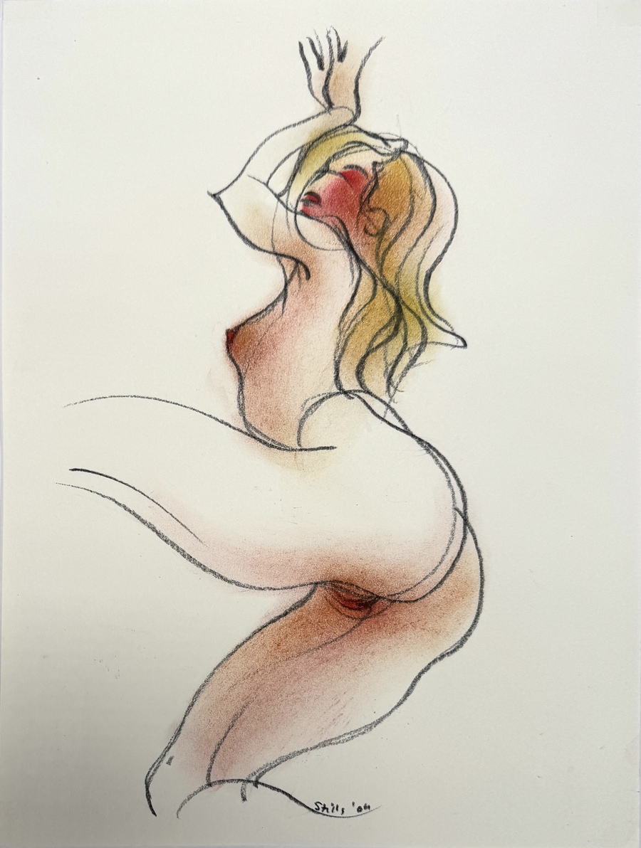 Tekening in moderne figuratieve stijl van T. Stills, 2004, getiteld "Notitie van een vluchtig erotisch moment". Uitgevoerd op papier in potlood en pastel, gemengde techniek. Rechtsonder gesigneerd “Stills ’04” en op de achterzijde met potlood gesigneerd en getiteld. Het werk toont een expressieve voorstelling van een vrouwelijk naakt met vloeiende lijnen, dynamische houding en subtiele kleuraccenten.