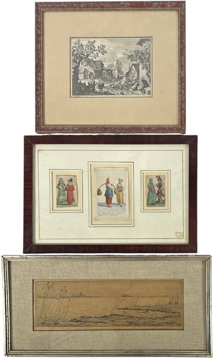 Drie werken op papier: een 17e-eeuwse dorpsscène naar Matthäus Merian (1593–1650), een verzameling van drie 18e-eeuwse handgekleurde prenten met volkse kleding door Pierre Mariette (1603–1657) en een ets van Johan Hemkes (1894–1988), rechtsonder gesigneerd, met oplagenummer 3/150 linksonder. Uitgevoerd op papier in etstechniek, deels handgekleurd, alle gemonteerd in houten en goudkleurige lijsten.