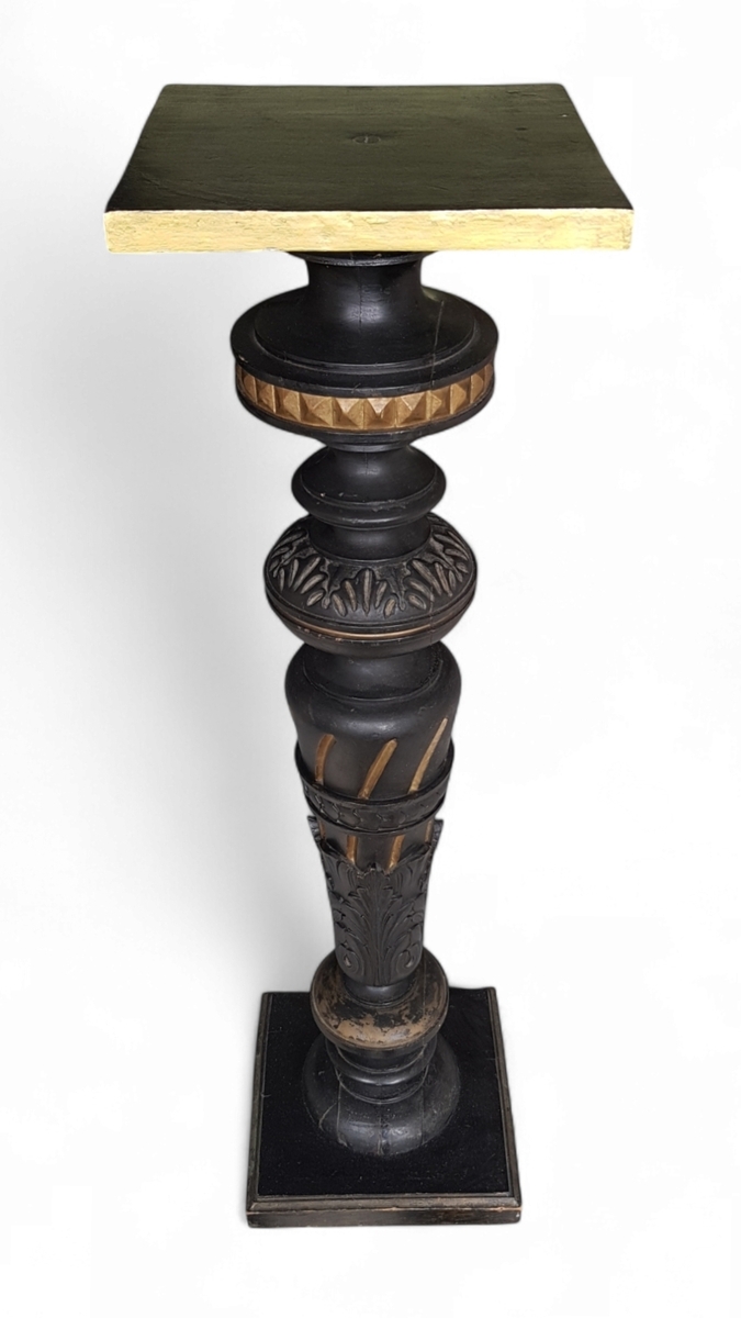 Deze piëdestal uit de 20e eeuw is uitgevoerd in neorenaissance stijl. Het object is vervaardigd uit hout met een geverfde afwerking in zwart en goudkleurig. De schacht heeft gedraaide en uitgesneden elementen, wat kenmerkend is voor de stijl. Het object is op een vierkante basis gemonteerd en heeft een vierkante top, beide met goudkleurige rand.