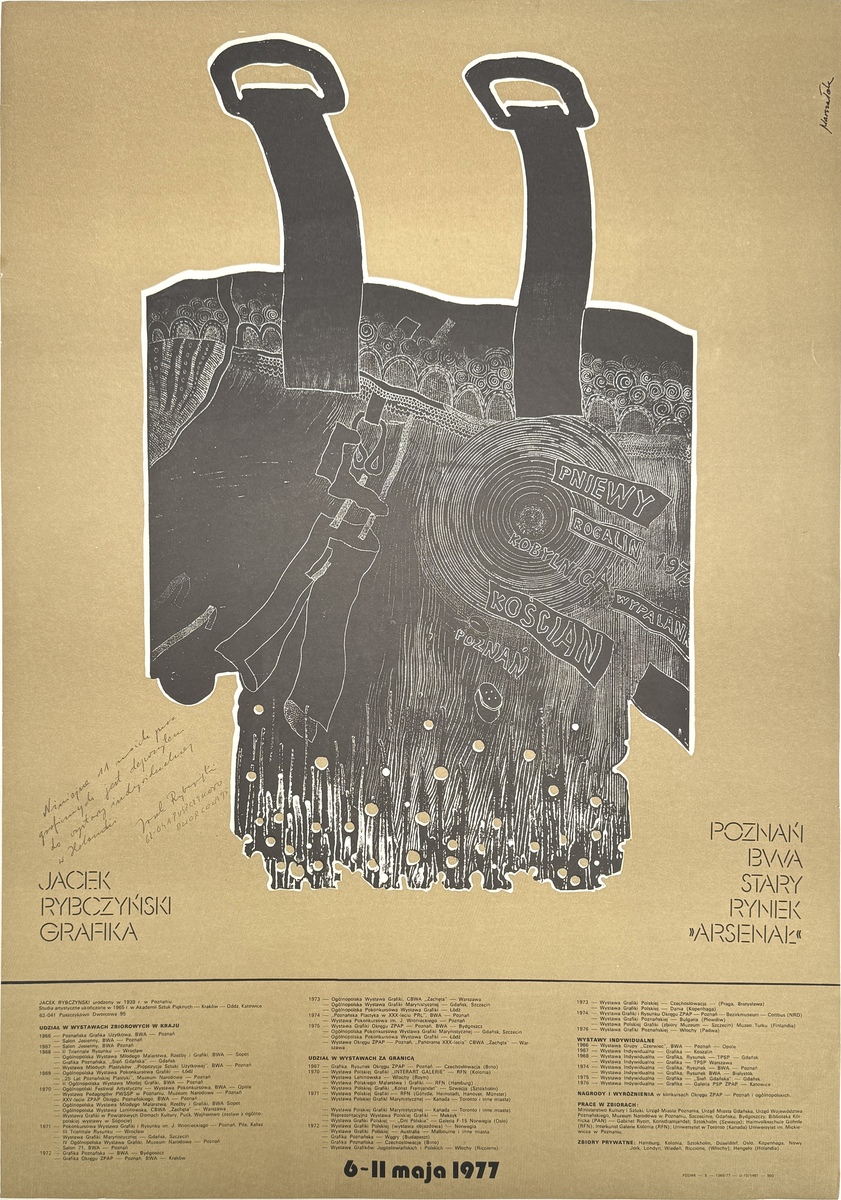 Poster van Jacek Rybczyński (1939-2016), gedateerd 1977, uitgevoerd in papier en gedrukt in grafische affichetechniek. Het ontwerp toont een abstracte compositie in zwart op goudkleurige achtergrond met tekstuele elementen. Rechtsonder bevindt zich een handgeschreven opdracht en rechtsboven een gesigneerde aanduiding. Het affiche kondigt de tentoonstelling “Jacek Rybczyński Grafika” aan in Poznań, BWA Stary Rynek Arsenal, gehouden van 6 tot 11 mei 1977.