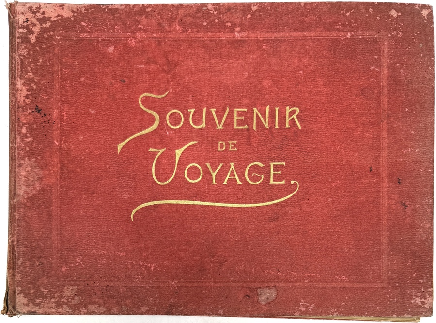 Een oblong album, daterend circa 1900-1920, bekleed met rode stof en voorzien van de titel "Souvenir de Voyage" in goudkleurige letters. Het album bevat diverse fotomechanische foto's en ansichtkaarten die Europese stadsgezichten, architectuur en landschappen uitbeelden. De kaarten, waarvan één met het jaartal 1908, zijn geproduceerd met lichtdruk of autotypie.