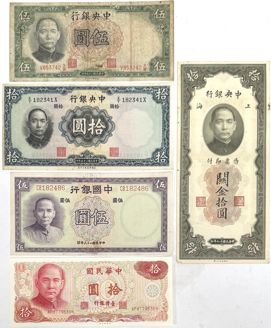 Vijf Chinese bankbiljetten uitgegeven door The Central Bank of China en Bank of China, daterend uit circa 1936–1954. Uitgevoerd in papier en gedrukt in hoogdruktechniek. De biljetten tonen portretten van Sun Yat-sen, architecturale stadsgezichten en gedetailleerde gravures. Waardes variëren tussen 5 en 10 yuan, elk voorzien van serienummers en tweetalige opschriften in Chinees en Engels, typerend voor deze periode.