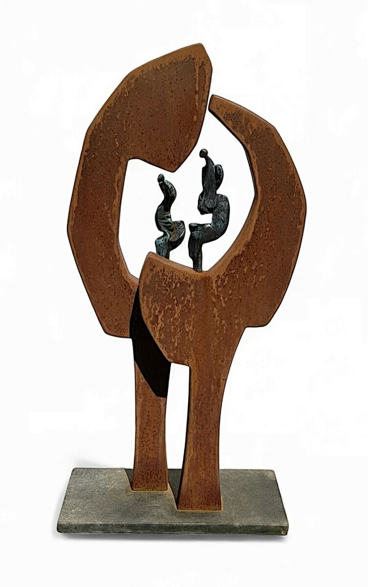 Een abstract modernistisch beeld vervaardigd omstreeks het laatste kwart van de 20e eeuw. Het beeld bestaat uit een open, roestkleurige ijzeren constructie die twee bronzen figuren met een donkere patina omvat. Het beeld is gemonteerd op een rechthoekige granieten voet.