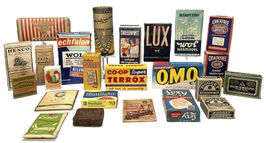 Gevarieerd lot vintage schoonmaakmiddelen uit de periode circa 1930-1960. De collectie omvat verpakkingen van diverse merken waaronder Lux, OMO en De Gruyter's. De objecten zijn gemaakt van karton, papier en metaal en zijn gedrukt met kleurrijke reclame-uitingen en logo's. De set omvat wasmiddel, schoenwit en glansmiddel, waarbij de verpakkingen de kenmerken van de functionalistische en commerciële vormgeving van de midden 20e eeuw tonen.