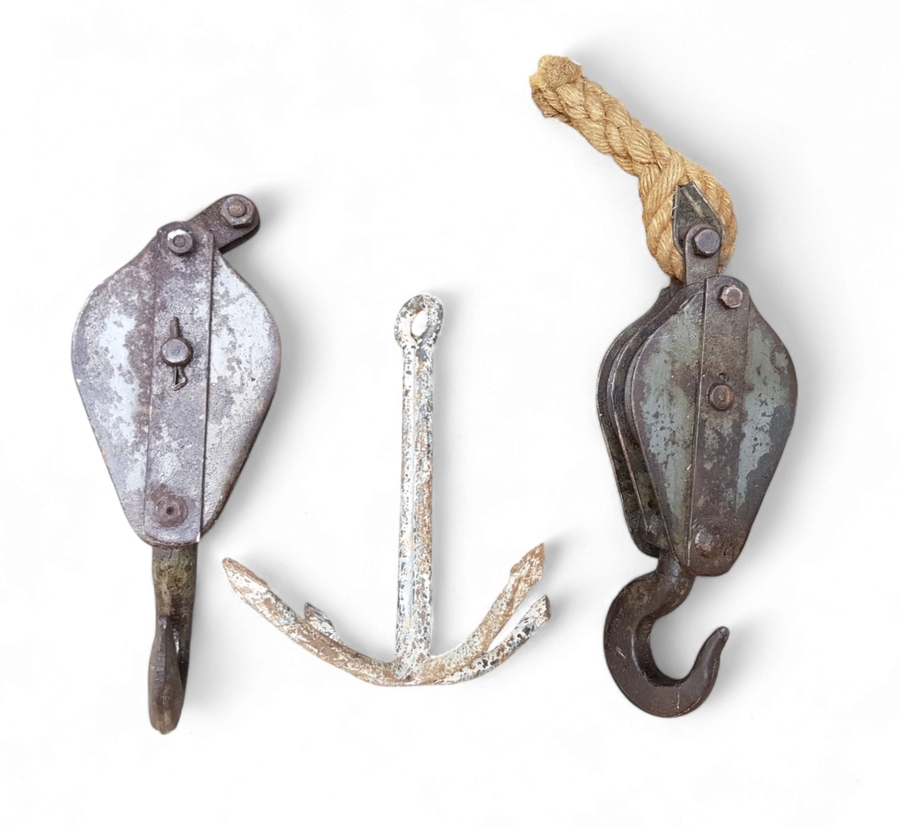 Lot nautica, midden 20e eeuw, bestaande uit twee ijzeren scheepskatrollen en een vierarmig ijzeren anker. Uitgevoerd in gesmeed en geperst ijzer met restanten van verf en sporen van corrosie; voorzien van haken en touwfragment. Herkomst volgens context maritiem gebruik.