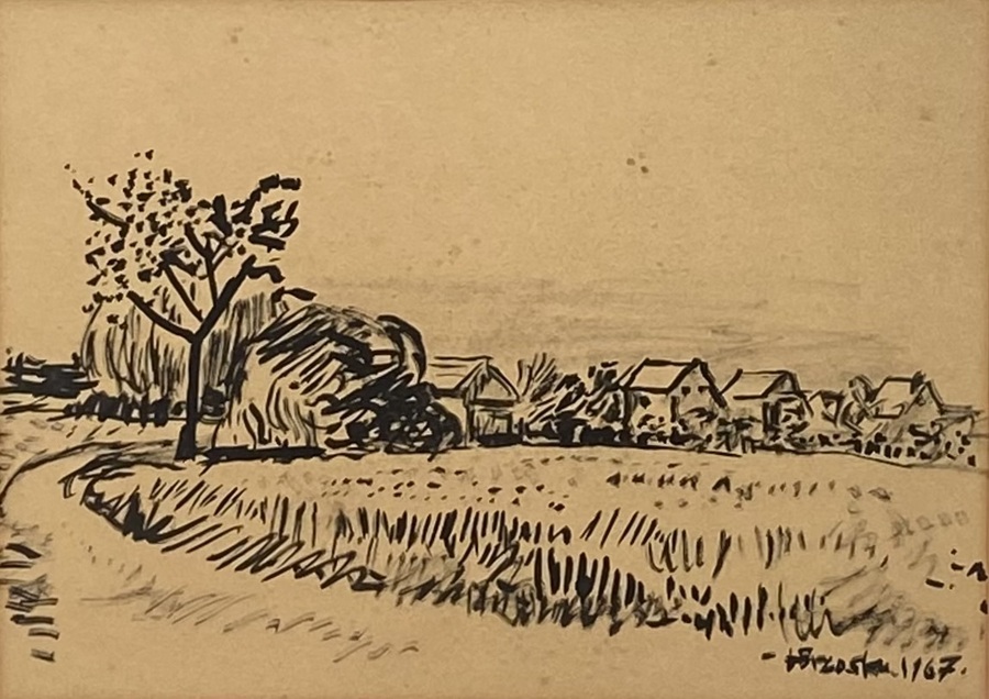 Inkttekening op papier, 1967, uitgevoerd in een schetsmatige en expressieve stijl met vloeiende lijnvoering. De voorstelling toont een landelijke weg met bomen en een rij boerderijen in de verte. Rechtsonder onduidelijk gesigneerd en gedateerd.