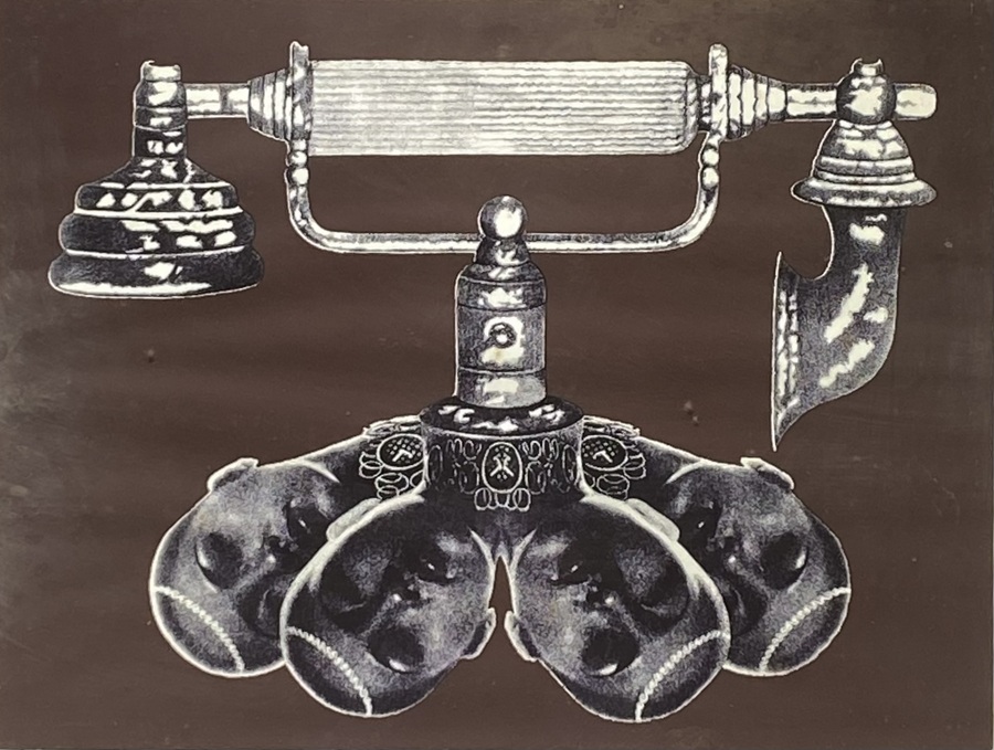 Litho van Jef Bosman, vervaardigd in 1975 en rechtsonder met potlood gesigneerd en gedateerd. Voorstelling van een klassieke telefoonhoorn in combinatie met vier samengevoegde kinderhoofden, in zwart-wit uitgewerkt tegen een donkere achtergrond. Uitgevoerd op papier.