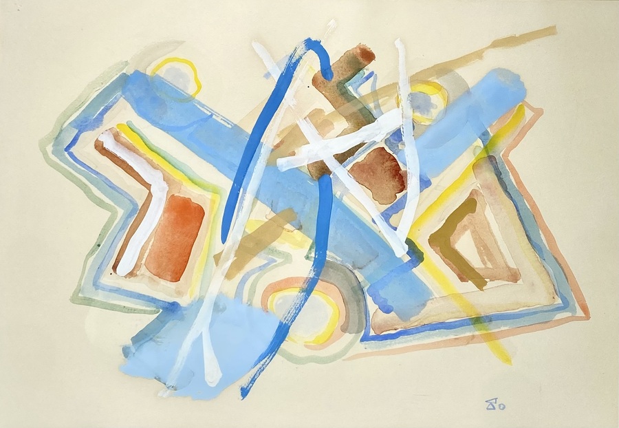 Gouache door J.B.M. Toby uitgevoerd op papier in abstract-expressionistische stijl, getiteld "voor Willem". Te zien zijn overlappende geometrische vormen en transparante kleurvlakken in blauw, bruin, geel en wit, rechtsonder gesigneerd met monogram. Verso informatie, het werk dateert uit de tweede helft 20e eeuw