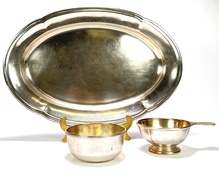 Verzilverd ensemble bestaande uit een ovaal dienblad, een vingerkommetje en een ijscoupe met korte greep, gemerkt SMN (Stoomvaart Maatschappij Nederland) aan de onderzijde. Uitgevoerd in functionele stijl en daterend uit circa midden 20e eeuw. Vervaardigd in verzilverd metaal met toegepaste pers- en drijfwerktechniek. Kenmerkend zijn de eenvoudige vormen, geprofileerde randafwerking en gladde oppervlakken, typerend voor gebruik in representatieve tafelcultuur.