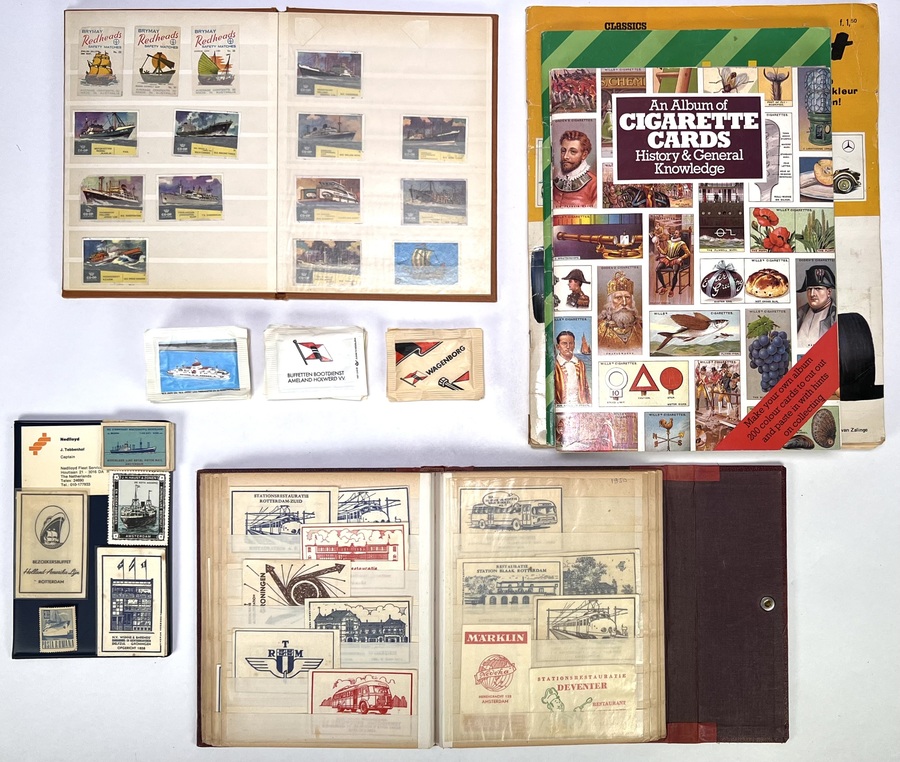 Verzameling parafernalia bestaande uit meerdere verzamelalbums en losse reeksen met sigarettenkaartjes, lucifermerken en geïllustreerde thema-albums, gedrukt in offset en lithografie op papier, midden tot eind 20e eeuw. Te zien zijn onderwerpen als autosport, dieren, goudkoorts en scheepvaart, alsook een Engelstalig sigarettenkaartjesalbum.