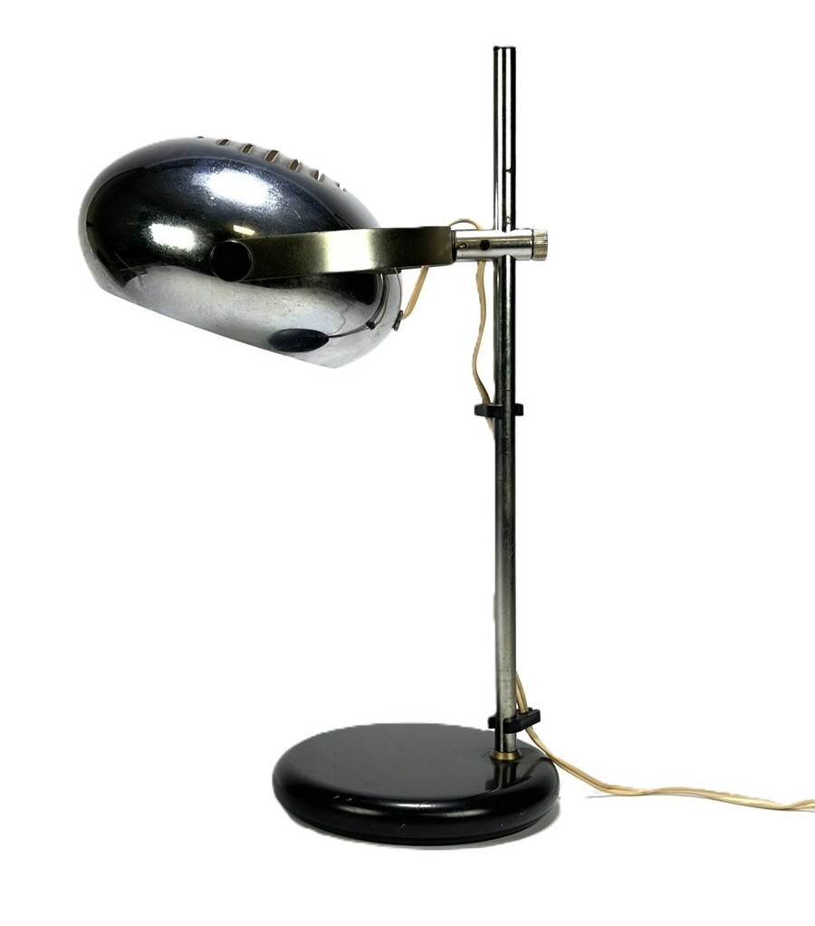 Vintage Space Age bureaulamp uit circa jaren '80, uitgevoerd in metaal met verchroomde kap en zwarte voet. Industrieel vervaardigd met stans- en montagewerk. Kenmerkend zijn de bolvormige kap met horizontale ventilatiesleuven, verstelbare hoogte en kantelbare constructie. De lamp combineert functionele techniek met futuristische esthetiek, typerend voor de Space Age stijl.