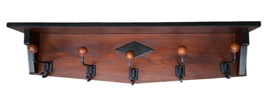 Art Deco kapstok, vervaardigd omstreeks jaren 1920–1930. Uitgevoerd in hout en metaal met vijf metalen haken voorzien van ronde houten knoppen. Kenmerkend zijn de strakke horizontale belijning, donkere contrasterende accenten en het geometrische ruitvormige detail centraal op de achterplaat.