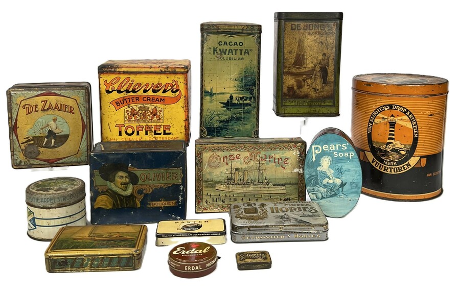 Verzameling bedrukte en gelithografeerde blikken uit circa eerste helft tot midden 20e eeuw. Aanwezig zijn ronde, ovale en rechthoekige exemplaren, voorzien van kleurrijke reclameopdrukken zoals Petrovitch’s Mocca Hopjes, Cacao Kwatta, Onze Marine, Pears Soap, Olivier Bouquet, De Zaaier, Erdal Schoensmeer en Van Slooten’s Vuurtoren. De decoraties bevatten schepen, zeilboten, portretten en reclame-illustraties.
