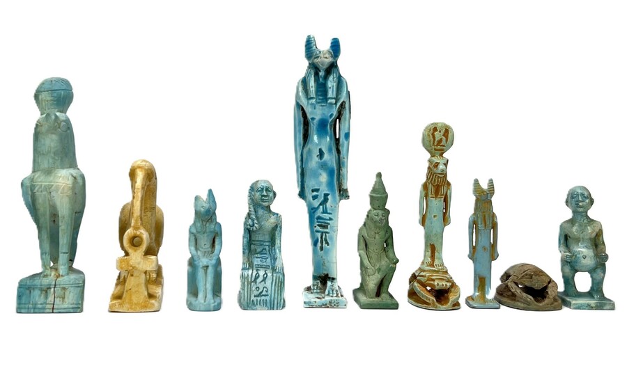 Egyptische keramische beeldjes, vervaardigd 20e eeuw, uitgevoerd in glazuurtechniek. Te zien zijn diverse goden- en dierenvoorstellingen waaronder Horus, Anubis, Thoth, een scarabee en mensfiguren, in blauw- en groentinten met hiërogliefachtige inscripties.