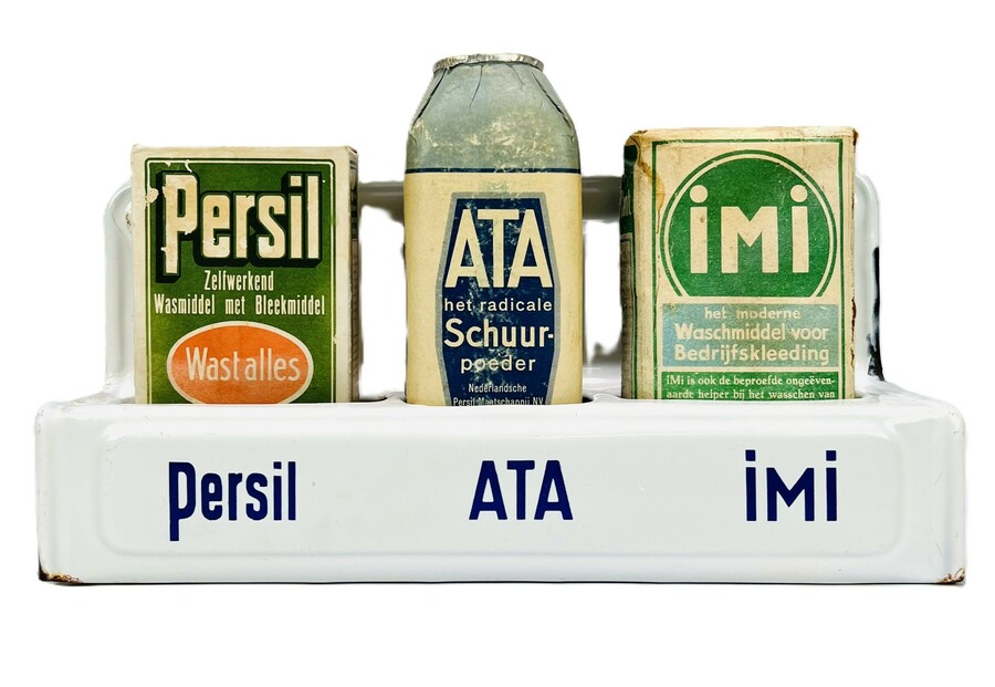 Vintage emaille rek vervaardigd uit geëmailleerd metaal, met wandophangsysteem en kobaltblauwe belettering voor Persil, ATA en imi. Uitgevoerd met drie compartimenten waarin originele verpakkingen zijn geplaatst. Typisch voor midden 20e-eeuwse huishoudstijl, vervaardigd circa 1950. De toegepaste techniek is emailleren op plaatstaal. Functioneel ontwerp met afgeronde vormen en heldere merktypografie, bedoeld voor huishoudelijk of winkelgebruik.