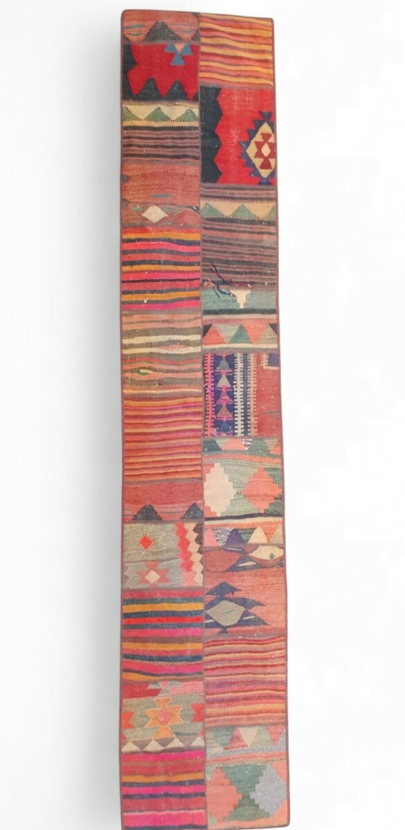 Kilim-patchwork loper, omstreeks late 20e eeuw. Uitgevoerd in wol op katoen; platweefsel (kilim) met later aaneen gestikte panelen. Kenmerkend zijn geometrische ornamenten en streepmotieven in warme rood-, oranje- en blauwtinten, verdeeld in smalle stroken en blokken met smalle boord. Gebruiksdoel als vloer- of gangloper. Herkomst naar stijl Anatolië/Turkije; patchwork samengesteld uit vintage kelims en afgewerkt met verstevigde randen.