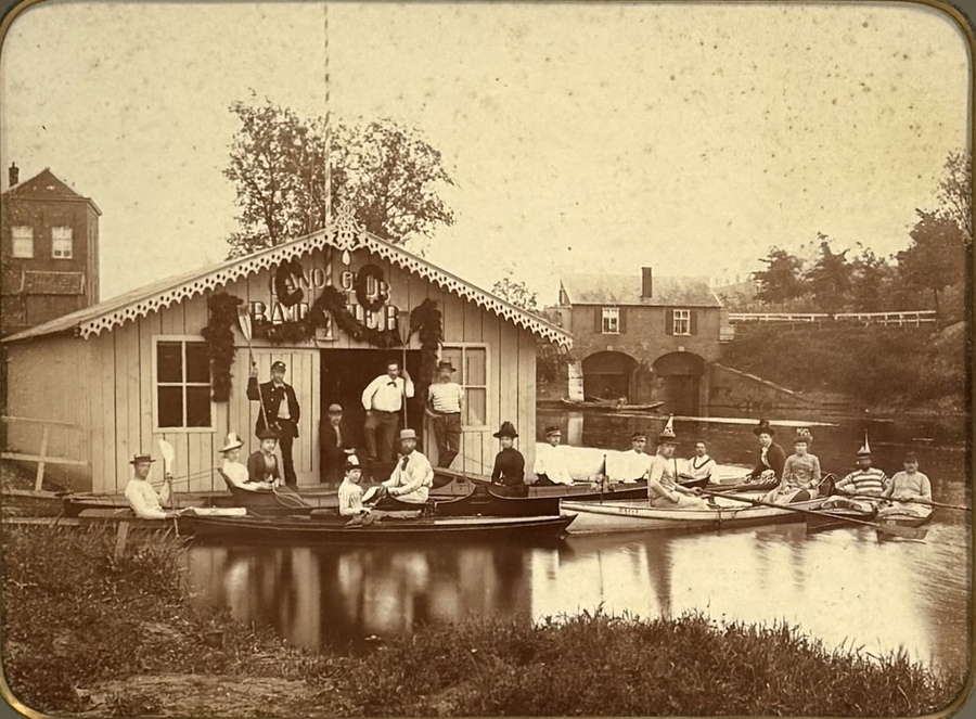 Albumine fotoprint, eind 19e eeuw, met voorstelling van leden van een kanoclub voor hun houten clubhuis aan het water. De foto toont mannen en vrouwen in kano’s en aan de wal, met het opschrift Cano Club boven de ingang. Afdruk op karton, achter passe-partout in houten lijst met goudkleurige ornamenten.
