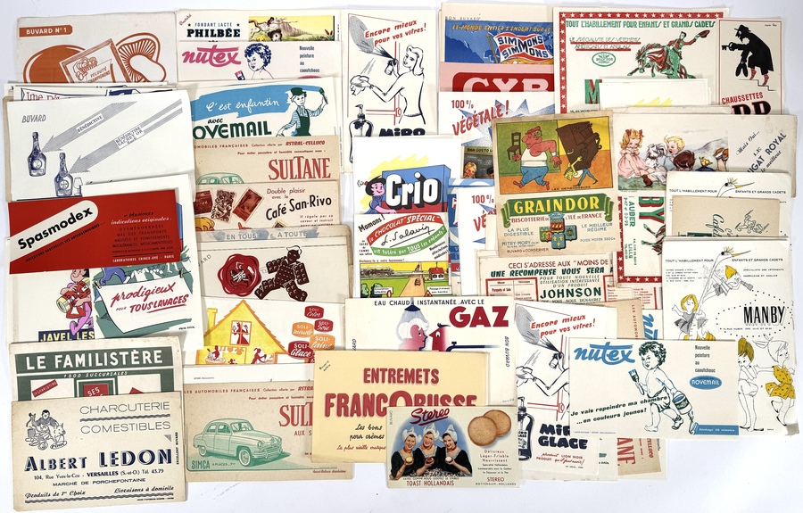 Verzameling Franse reclamedrukwerken en blotters op papier, midden 20e eeuw, uitgevoerd in offset/lithografie. Aanwezig zijn uiteenlopende illustraties met product reclames, slogans en merknamen zoals Spasmodex, Crio, Grain d’Or en Novemail. Kenmerkend zijn de kleurrijke commerciële beeldtaal en het gebruik van zowel tekst als gestileerde figuren en producten, typerend voor de Franse reclamecultuur van die periode.