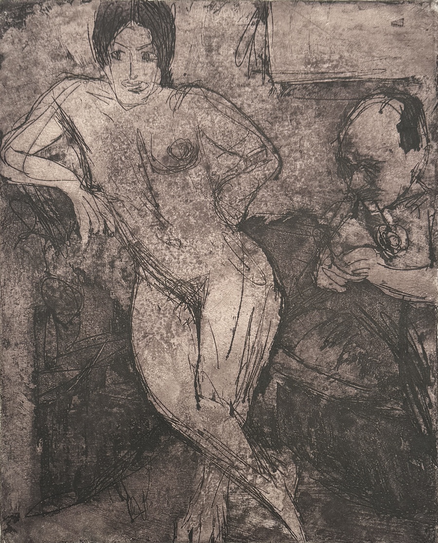 Ets op papier van Jan Altink (1885–1971), uitgevoerd in expressionistische stijl en verwant aan de Groninger kunstenaarsgroep De Ploeg. Voorstelling van een naakte vrouw geflankeerd door een zittende man, in contrastrijke lijnvoering en vlakken. Het werk is rechtsonder met potlood gesigneerd “J. Altink”. Altink geldt als een van de oprichters en belangrijkste figuren van De Ploeg.
