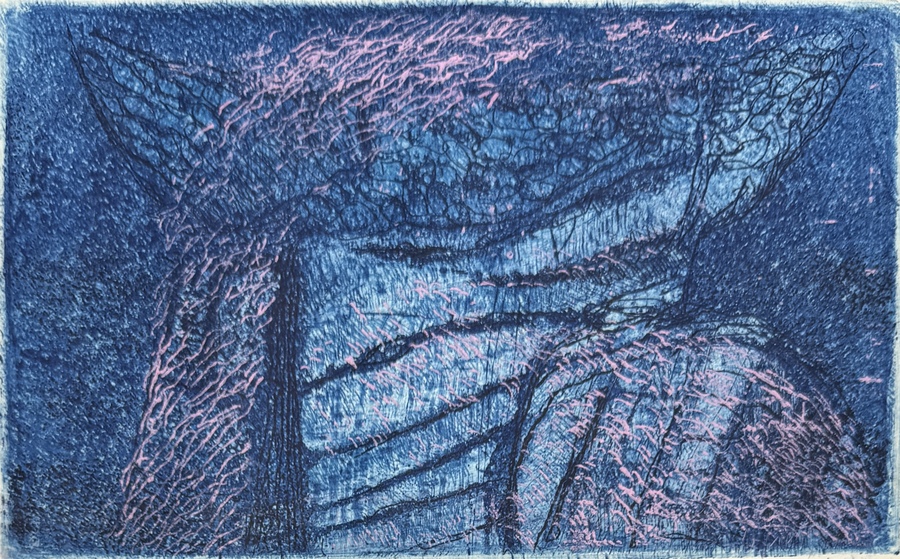 Ets in kleur van Peter Achttienribbe (geboren 1942, Groningen), tweede helft 20e eeuw. Uitgevoerd op papier in abstract-expressionistische stijl, met een grafische compositie in blauw en roze tonen. Rechtsonder met potlood gesigneerd.