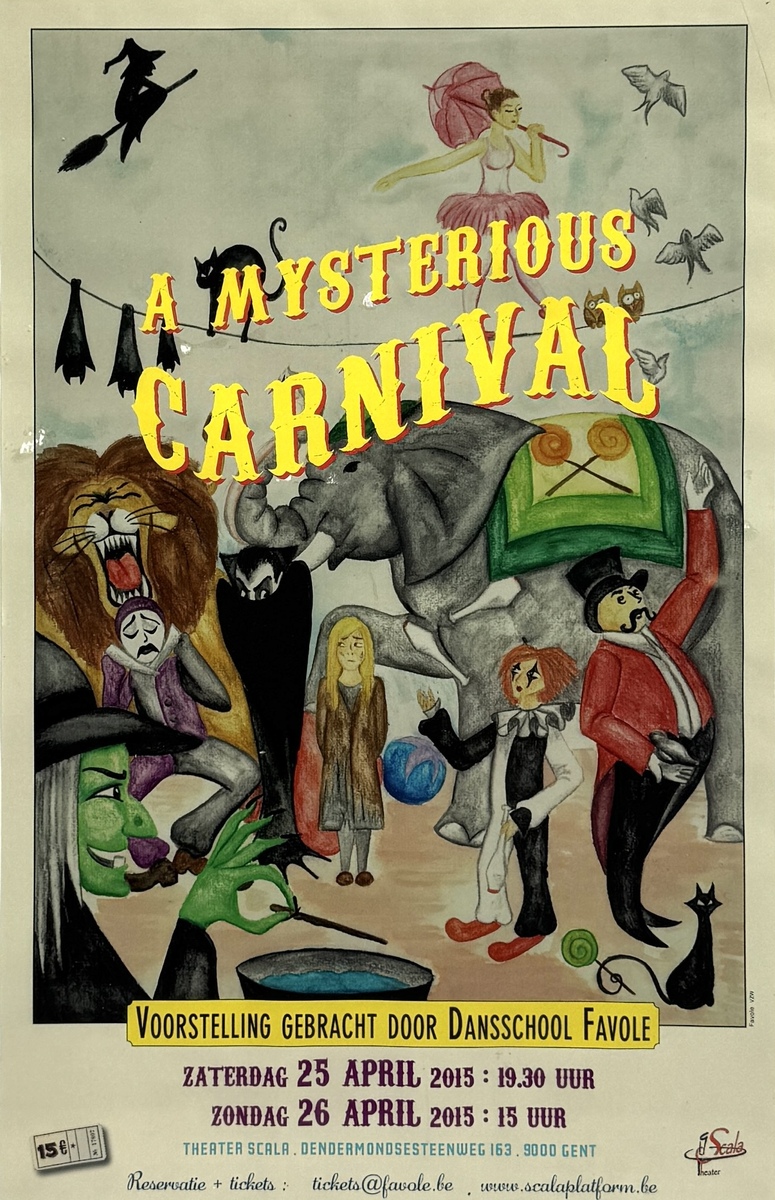 Een affiche in een figuratieve en illustratieve stijl getiteld "A Mysterious Carnival", gedateerd 2015. Het affiche is vervaardigd van papier en gedrukt door middel van offsetdruk. De voorstelling omvat een mix van circus- en horrorfiguren, zoals een leeuw, een heks en een olifant, in felle kleuren. De affiche werd uitgebracht door Dansschool Favole.