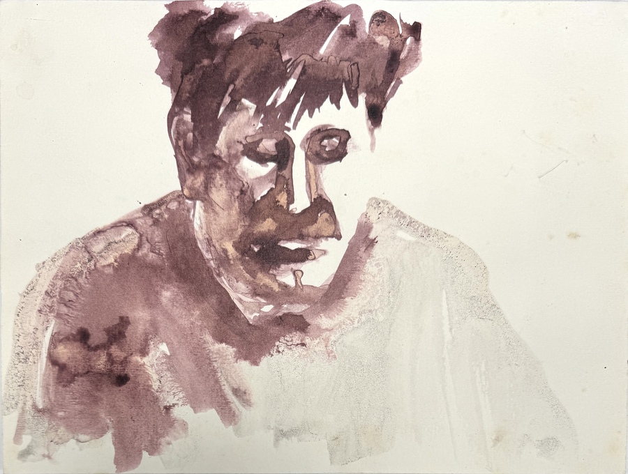 Aquarel van Joep Hiep, tweede helft 20e eeuw. Uitgevoerd op papier in expressieve stijl met schetsmatige penseelvoering. Voorstelling van een portret in bruinrode aquareltonen met onbewerkt gelaten achtergrond. Aan de achterzijde met potlood gesigneerd Joep Hiep.