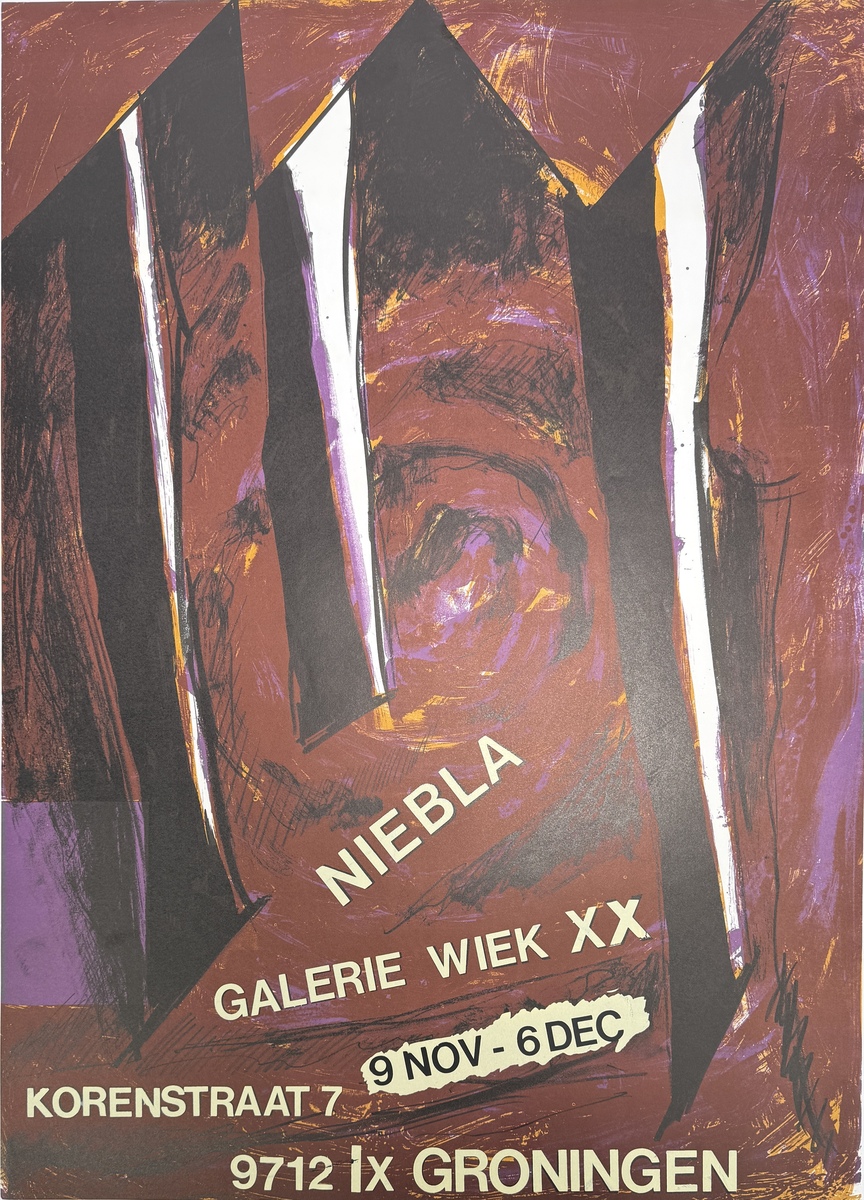 Affiche voor de tentoonstelling “Niebla”, Galerie Wiek XX, Groningen, 9 november – 6 december, eind 20e eeuw. Uitgevoerd in abstract-expressionistische stijl, gedrukt op papier met toepassing van kleurenlithografie. Te zien zijn grote geometrische vlakken in donkere tinten met paarse en gele accenten, gecombineerd met typografie.