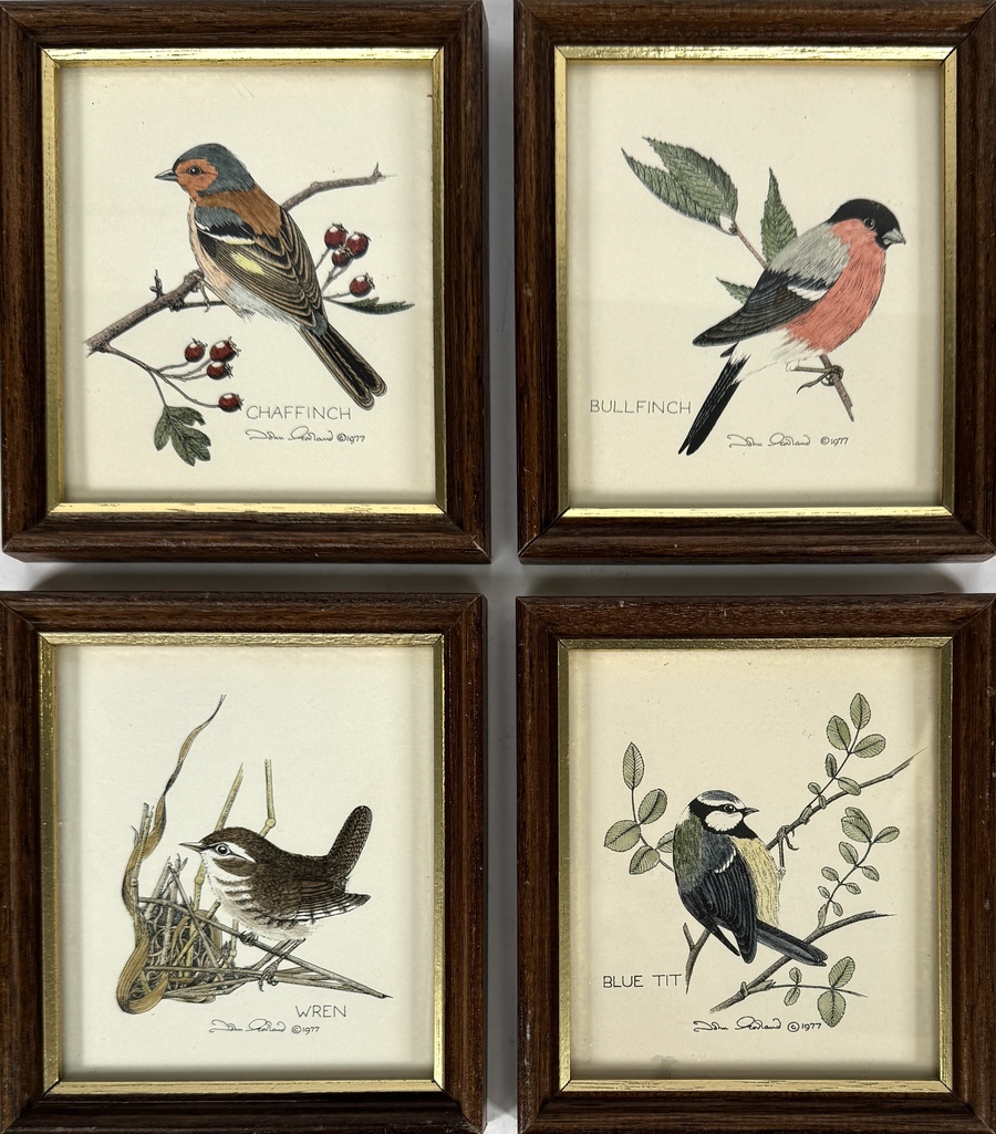 Vier gedrukte prentjes naar John Moreland (1945), gedateerd 1977, uitgegeven door Glastonbury Prints, Engeland. Voorstellingen van zangvogels “Chaffinch”, “Bullfinch”, “Wren” en “Blue Tit”. Realistische ornithologische stijl. Gedrukte prenten op papier, met de hand ingekleurd. Gevat in houten lijsten met goudkleurige binnenrand en voorzien van originele uitgeverslabels op de achterzijde.